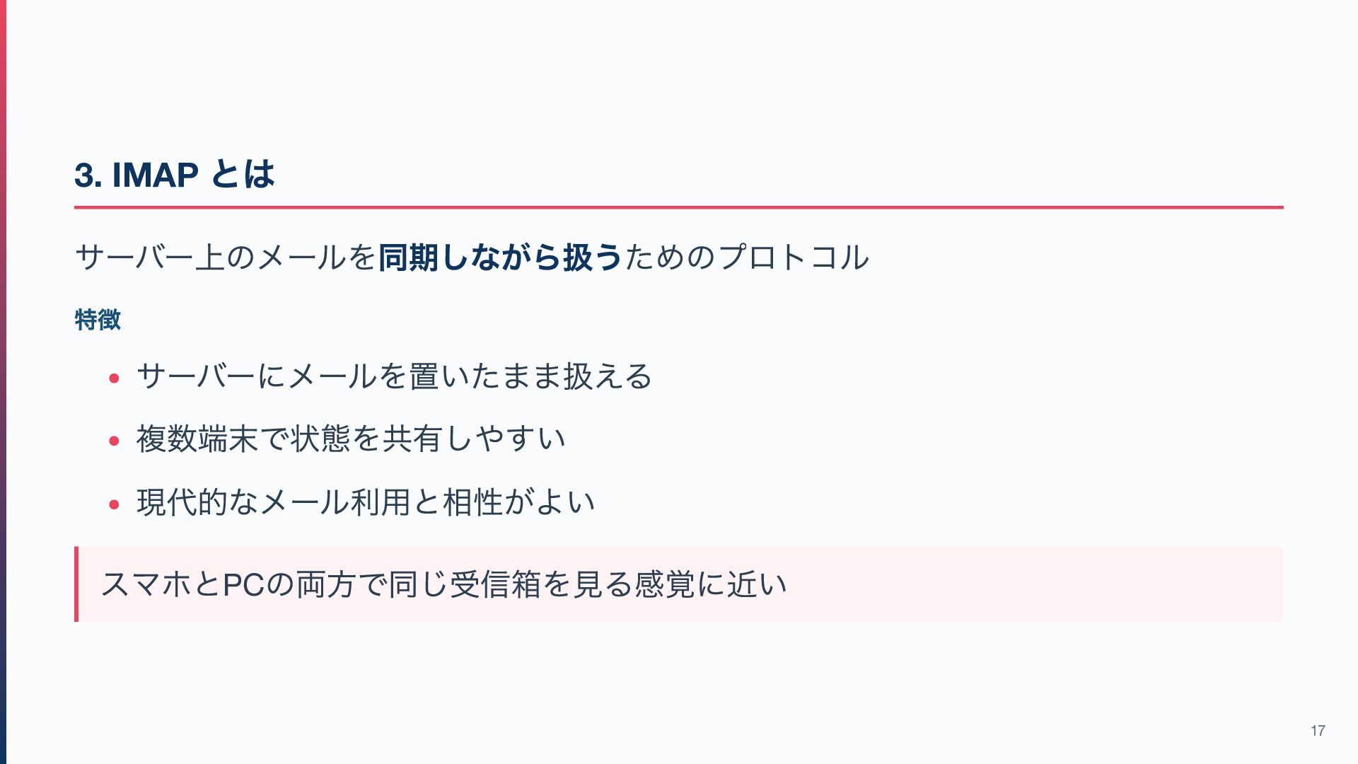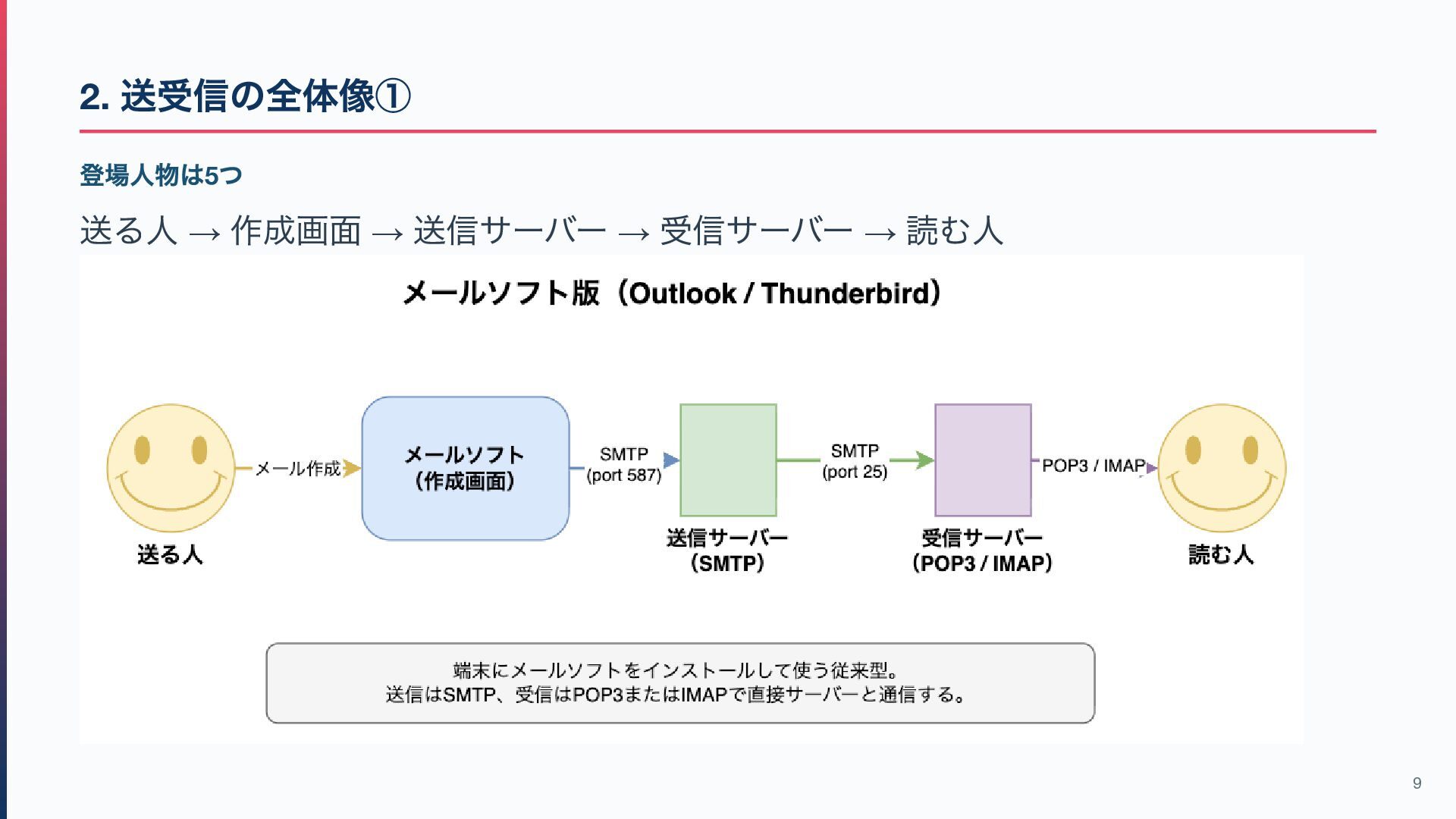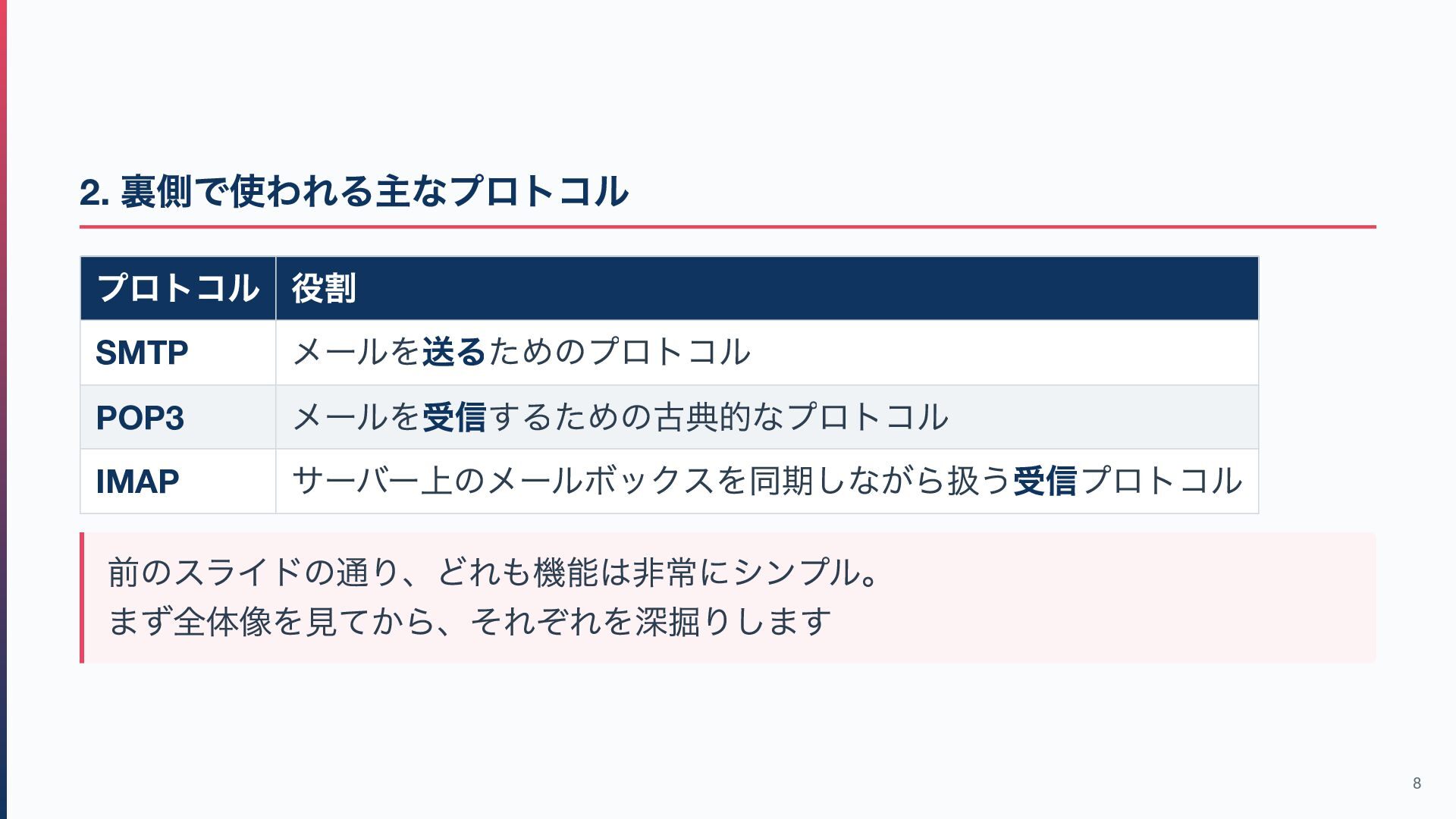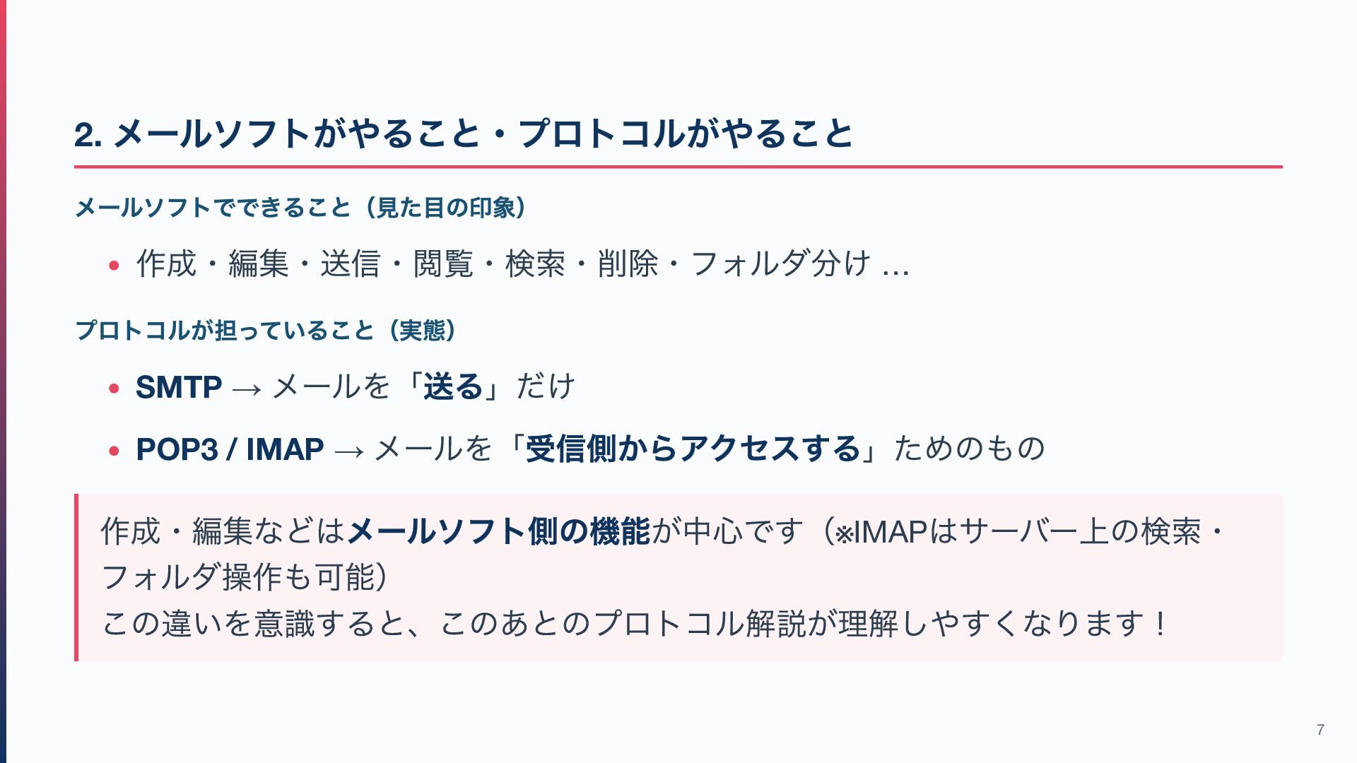 / IMAP → メールを「受信側からアクセスする」ためのもの 作成・編集などはメールソフト側の機能が中心です(※IMAP はサーバー上の検索・ フォルダ操作も可能) この違いを意識すると、このあとのプロトコル解説が理解しやすくなります! 7