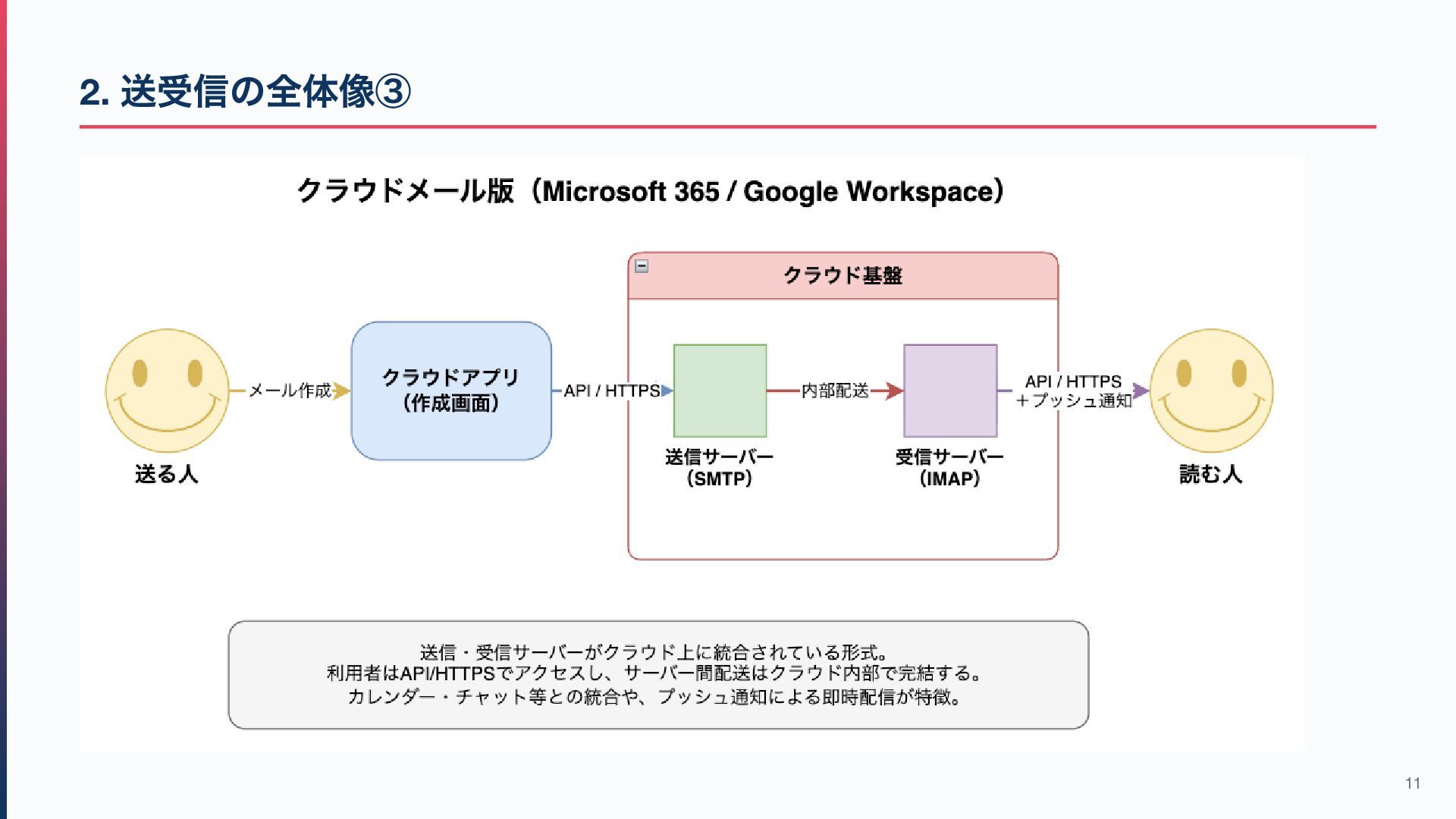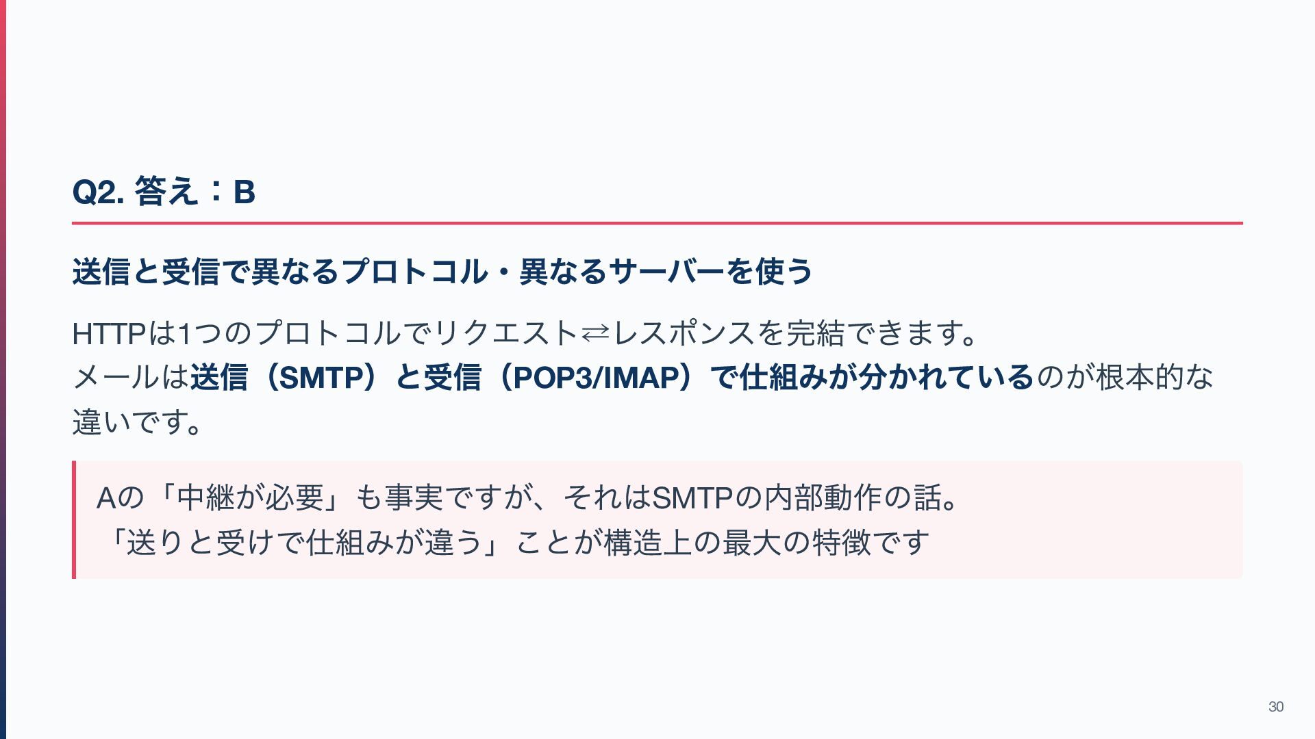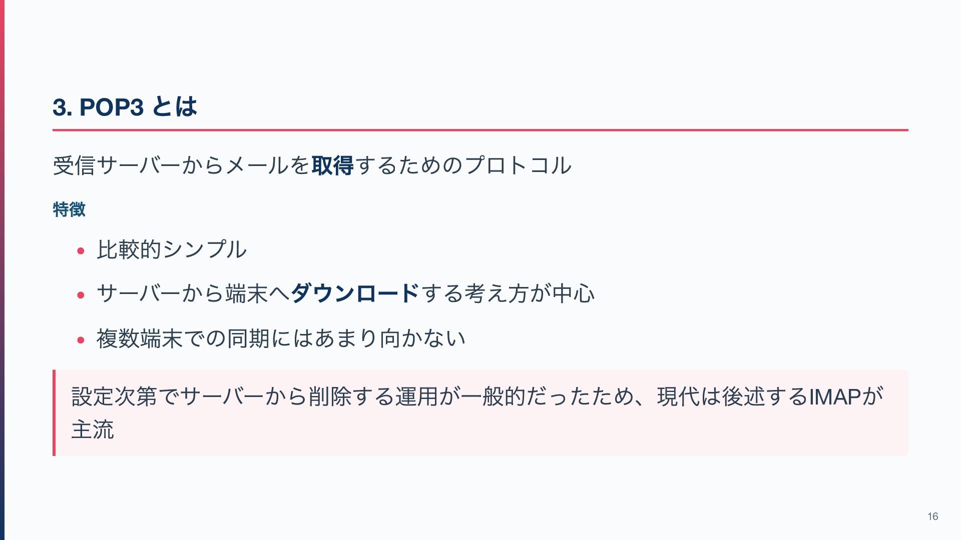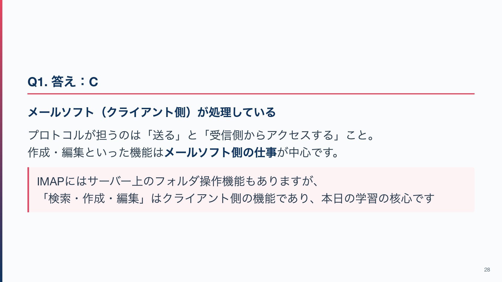 / IMAP → メールを「受信側からアクセスする」ためのもの 作成・編集などはメールソフト側の機能が中心です(※IMAP はサーバー上の検索・ フォルダ操作も可能) この違いを意識すると、このあとのプロトコル解説が理解しやすくなります! 7