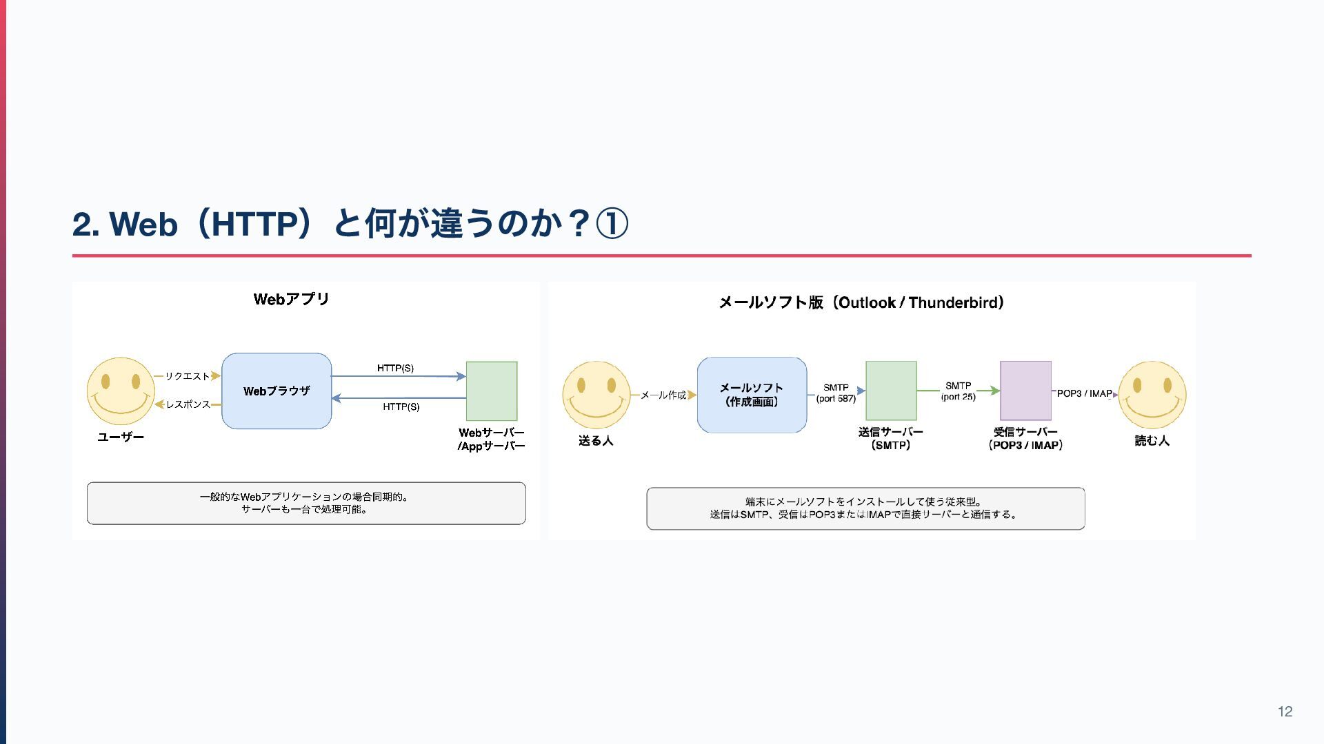 12. 5. Web 開発者として、どこまで理解すればよいか まずは次のレベルで十分: 3 つのプロトコルの役割の違いを説明できる メールの送受信の流れを説明できる メールソフト / Web