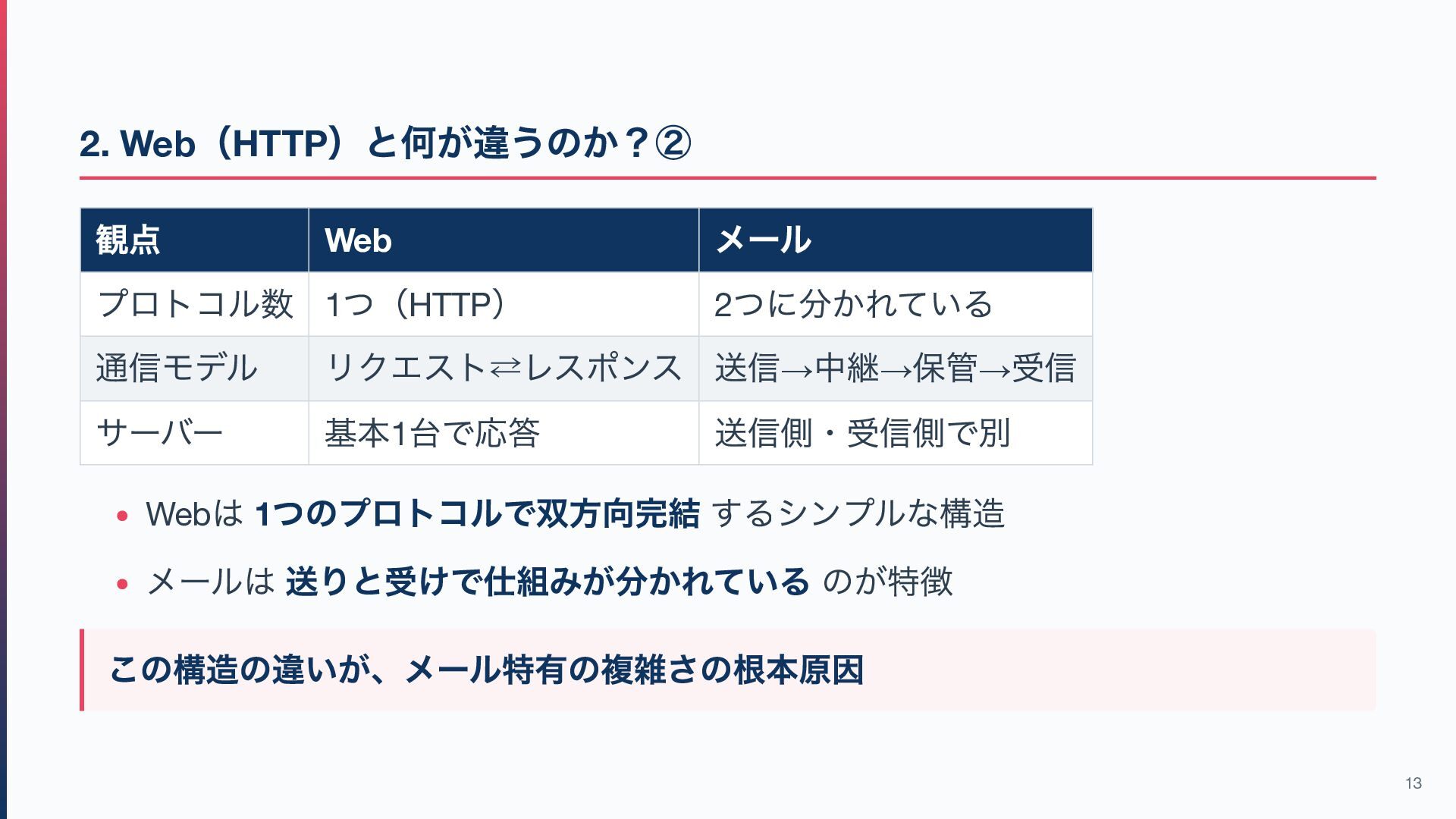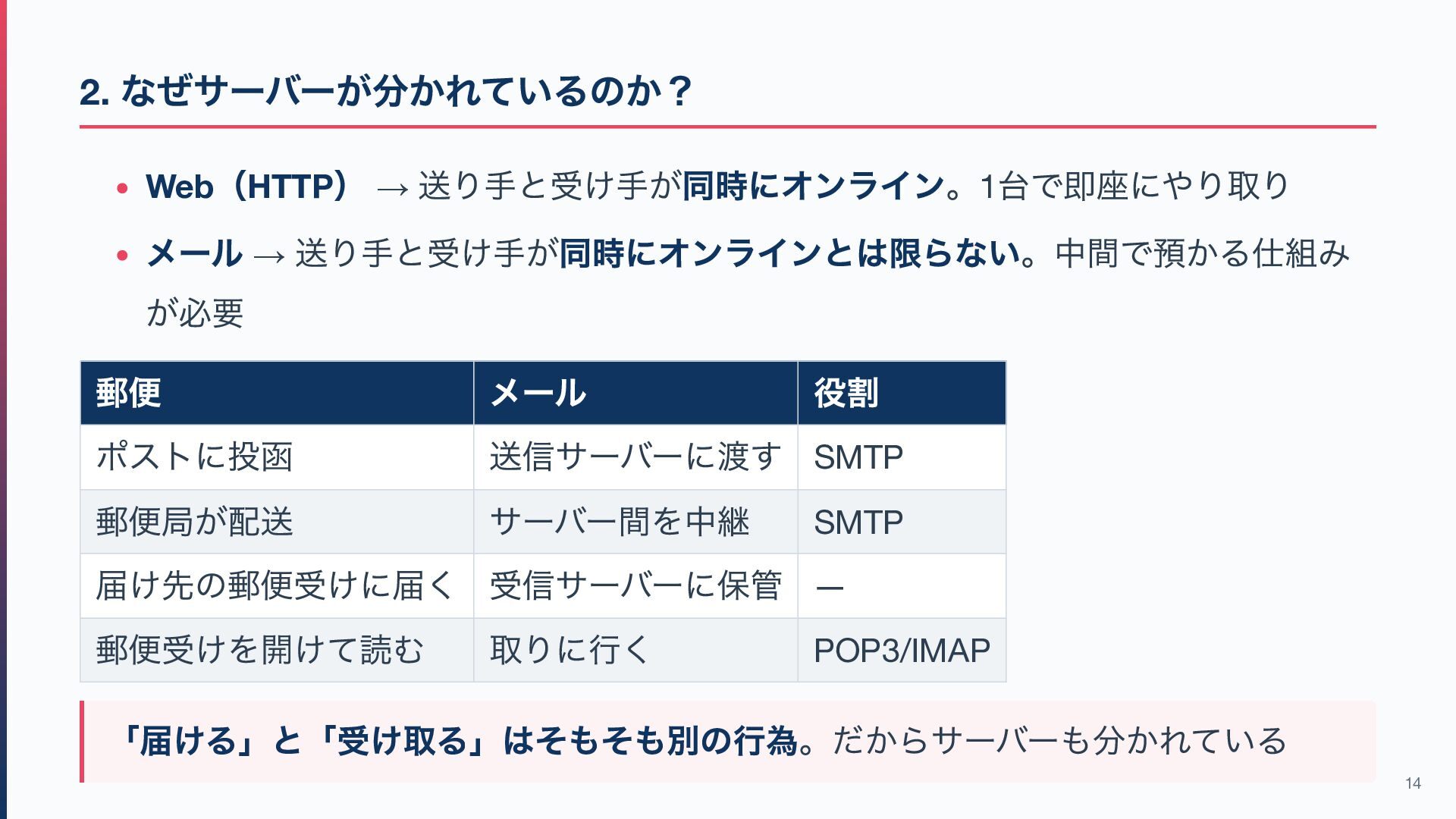 ) 2 つに分かれている 通信モデル リクエスト⇄レスポンス 送信→ 中継→ 保管→ 受信 サーバー 基本1 台で応答 送信側・受信側で別 Web は 1 つのプロトコルで双方向完結 するシンプルな構造 メールは 送りと受けで仕組みが分かれている のが特徴 この構造の違いが、メール特有の複雑さの根本原因 13