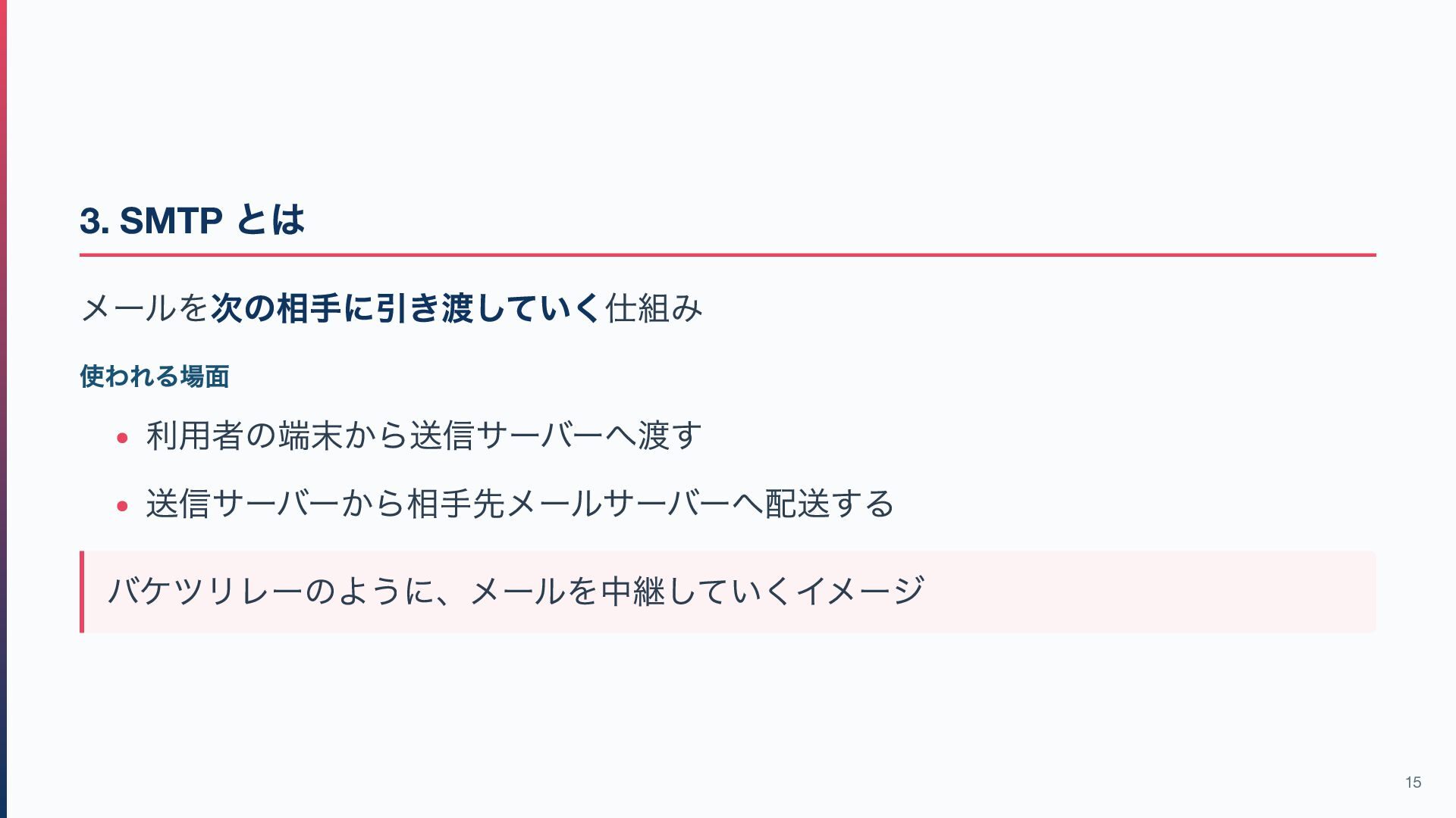 送り手と受け手が同時にオンラインとは限らない。中間で預かる仕組み が必要 郵便 メール 役割 ポストに投函 送信サーバーに渡す SMTP 郵便局が配送 サーバー間を中継 SMTP 届け先の郵便受けに届く 受信サーバーに保管 ― 郵便受けを開けて読む 取りに行く POP3/IMAP 「届ける」と「受け取る」はそもそも別の行為。だからサーバーも分かれている 14
