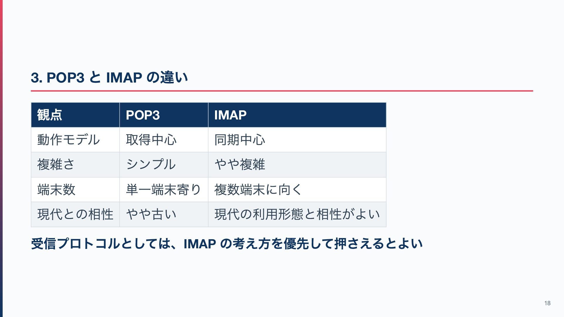 同期中心 複雑さ シンプル やや複雑 端末数 単一端末寄り 複数端末に向く 現代との相性 やや古い 現代の利用形態と相性がよい 受信プロトコルとしては、IMAP の考え方を優先して押さえるとよい 18