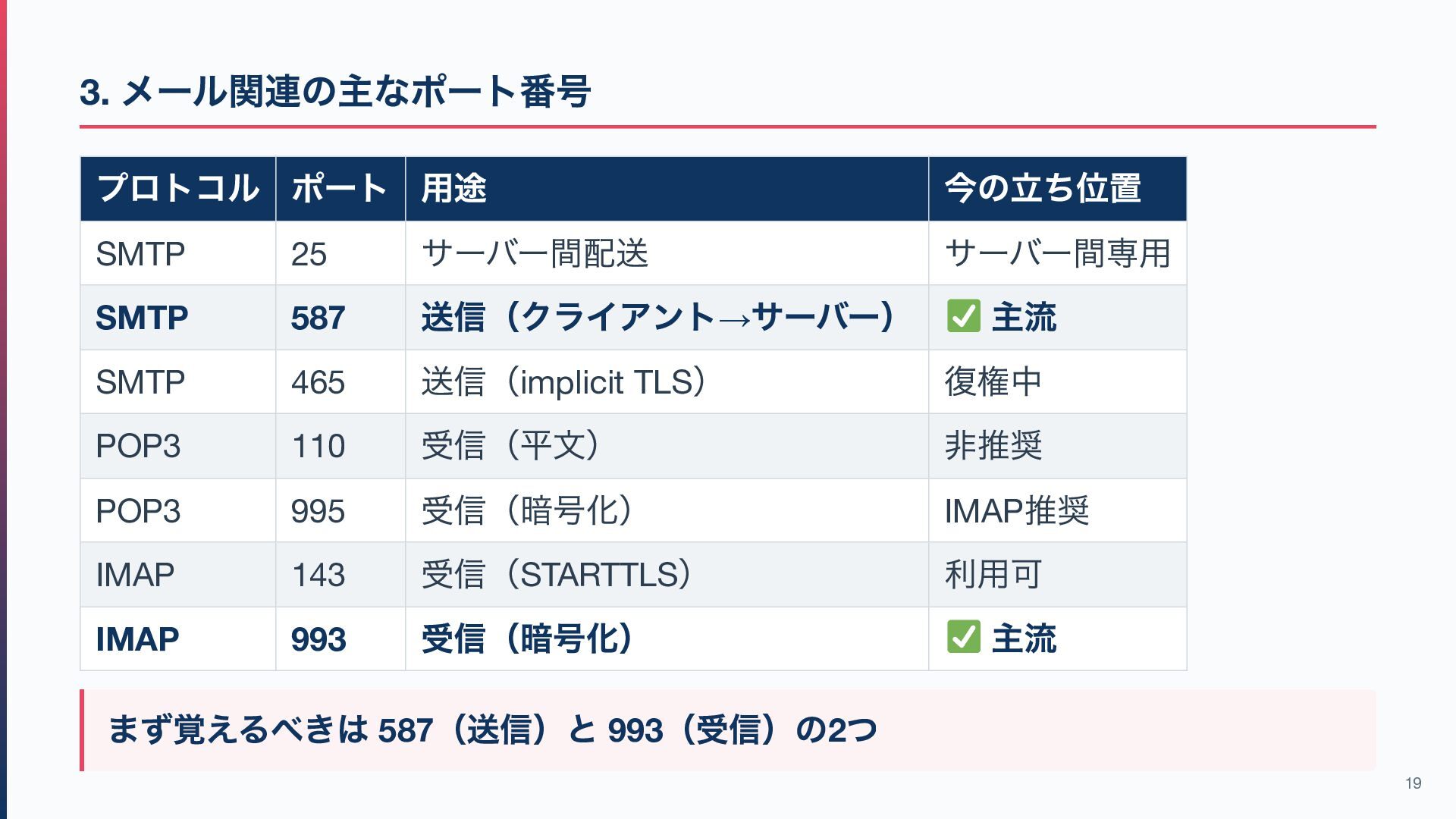 SMTP 587 送信(クライアント→ サーバー) 主流 SMTP 465 送信(implicit TLS ) 復権中 POP3 110 受信(平文) 非推奨 POP3 995 受信(暗号化) IMAP 推奨 IMAP 143 受信(STARTTLS ) 利用可 IMAP 993 受信(暗号化) 主流 まず覚えるべきは 587 (送信)と 993 (受信)の2 つ 19