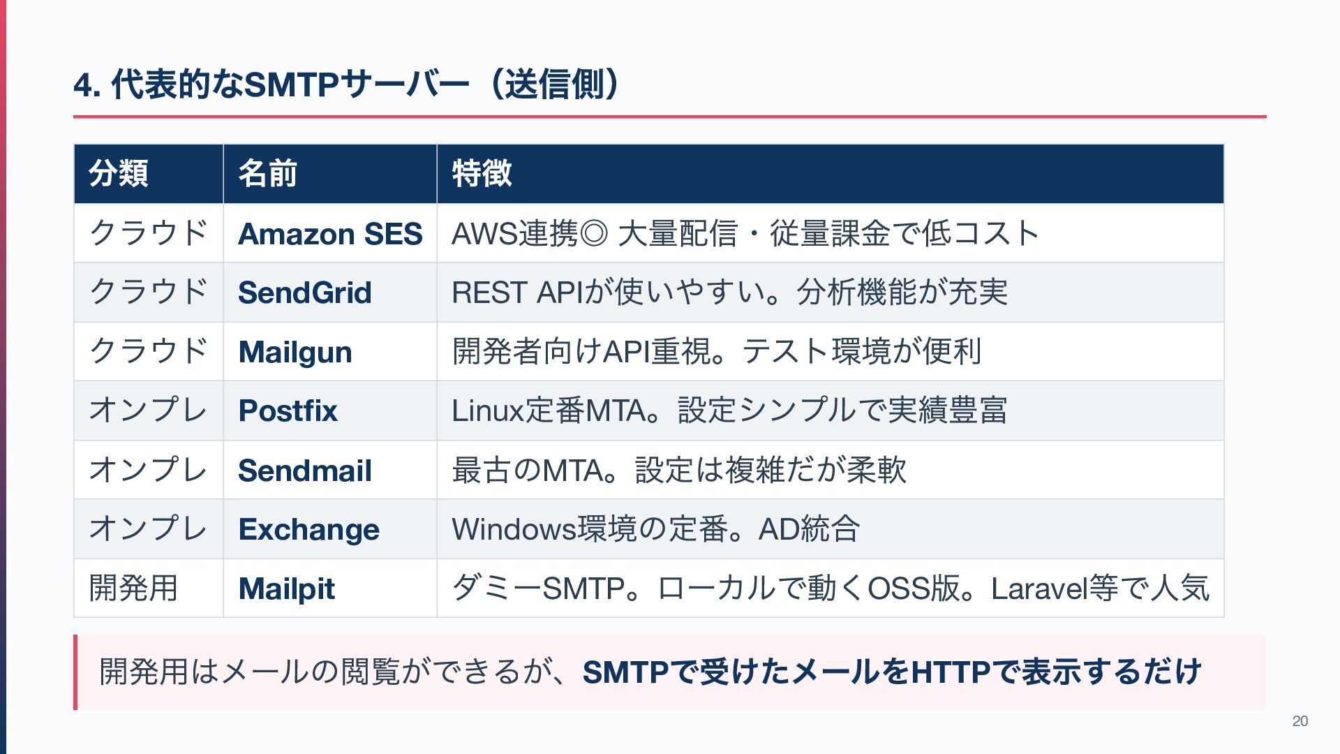 連携◎ 大量配信・従量課金で低コスト クラウド SendGrid REST API が使いやすい。分析機能が充実 クラウド Mailgun 開発者向けAPI 重視。テスト環境が便利 オンプレ Postfix Linux 定番MTA 。設定シンプルで実績豊富 オンプレ Sendmail 最古のMTA 。設定は複雑だが柔軟 オンプレ Exchange Windows 環境の定番。AD 統合 開発用 Mailpit ダミーSMTP 。ローカルで動くOSS 版。Laravel 等で人気 開発用はメールの閲覧ができるが、SMTP で受けたメールをHTTP で表示するだけ 20