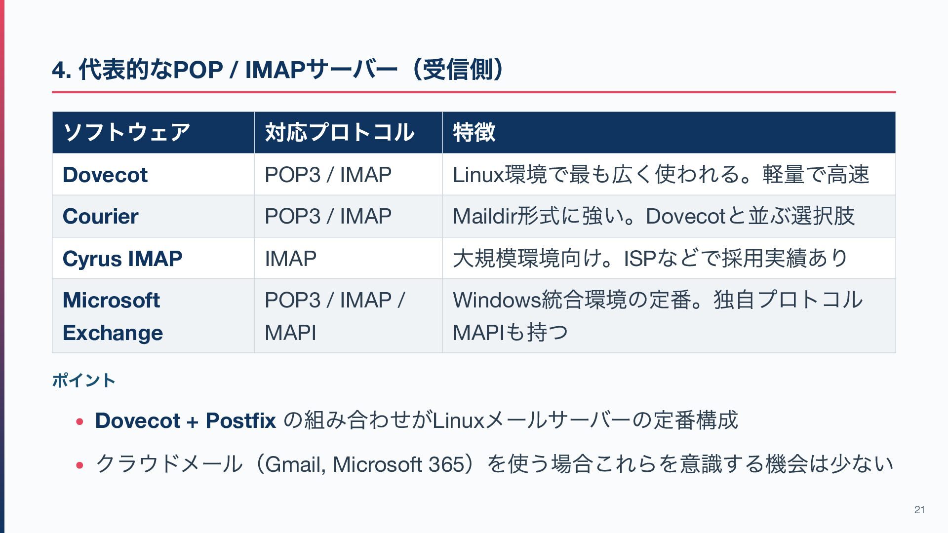 / IMAP Linux 環境で最も広く使われる。軽量で高速 Courier POP3 / IMAP Maildir 形式に強い。Dovecot と並ぶ選択肢 Cyrus IMAP IMAP 大規模環境向け。ISP などで採用実績あり Microsoft Exchange POP3 / IMAP / MAPI Windows 統合環境の定番。独自プロトコル MAPI も持つ ポイント Dovecot + Postfix の組み合わせがLinux メールサーバーの定番構成 クラウドメール(Gmail, Microsoft 365 )を使う場合これらを意識する機会は少ない 21