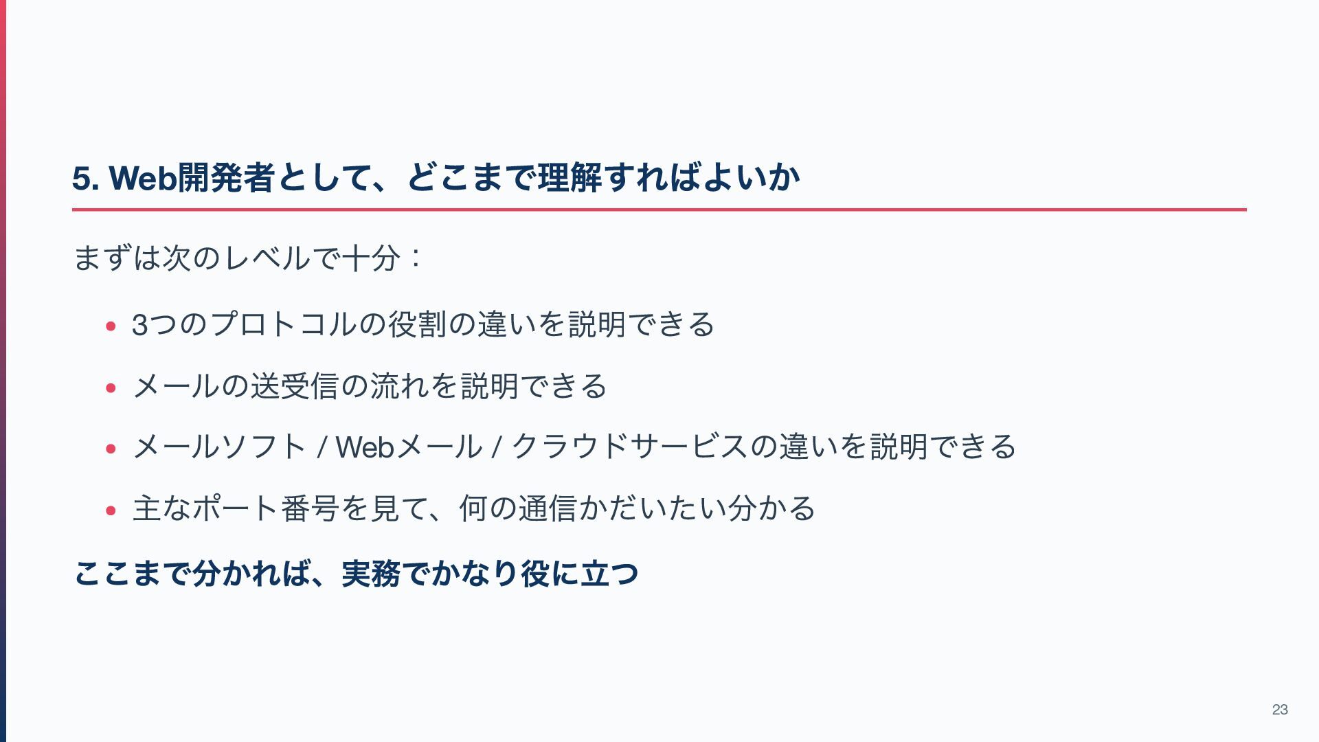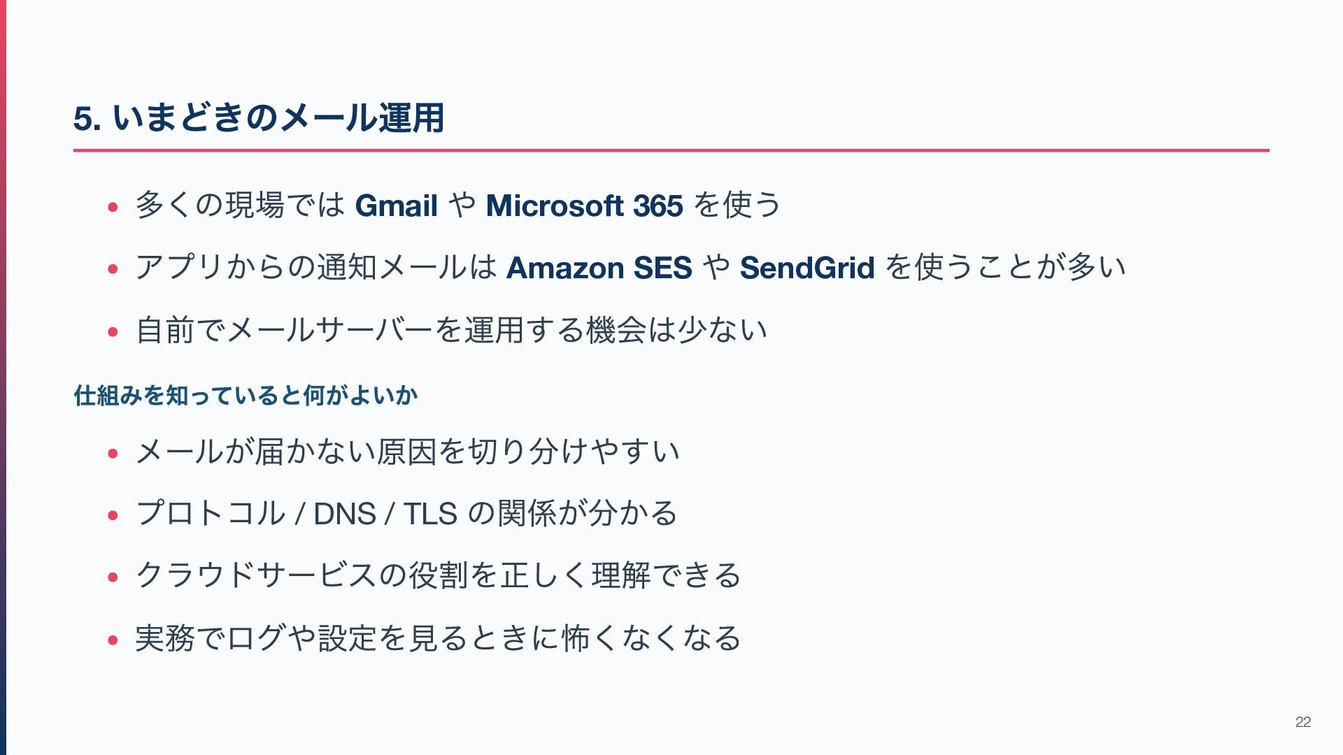SES や SendGrid を使うことが多い 自前でメールサーバーを運用する機会は少ない 仕組みを知っていると何がよいか メールが届かない原因を切り分けやすい プロトコル / DNS / TLS の関係が分かる クラウドサービスの役割を正しく理解できる 実務でログや設定を見るときに怖くなくなる 22