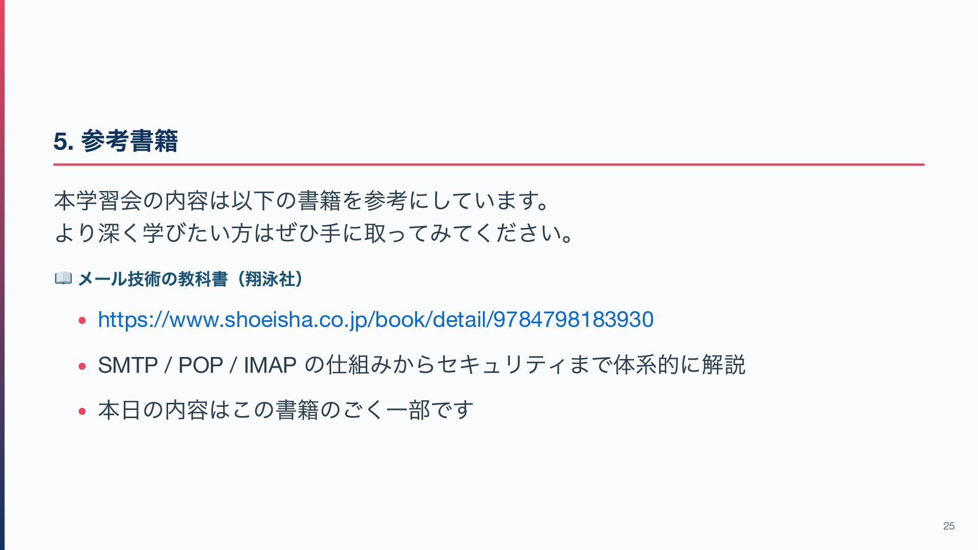 代表的なメールサーバー 5. 現代のメール運用とまとめ 6. 補足資料(時間次第) 2
