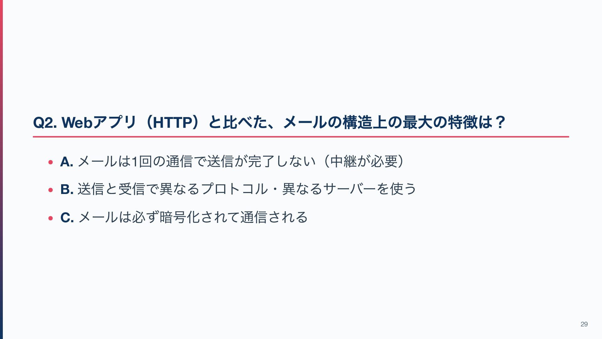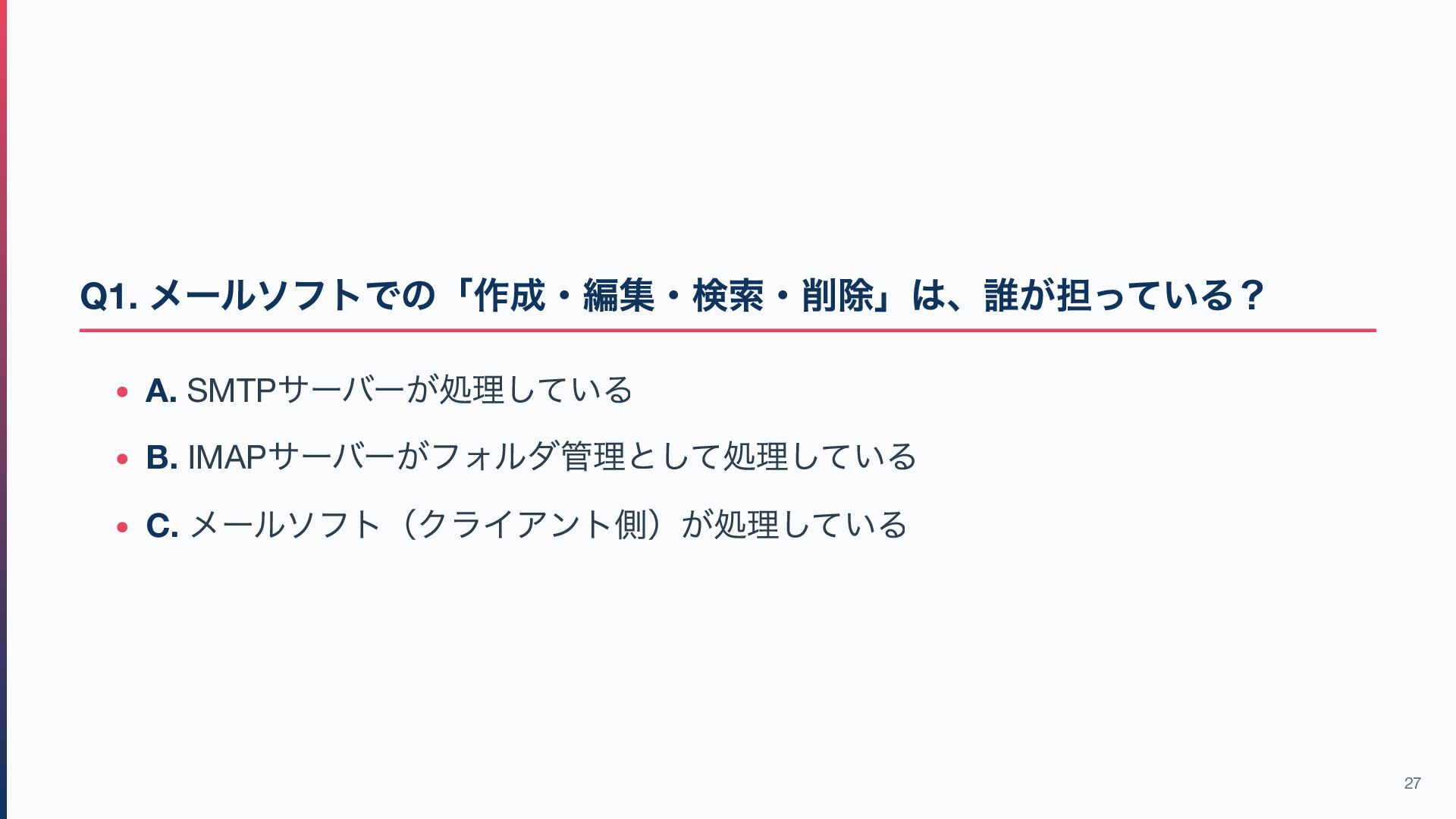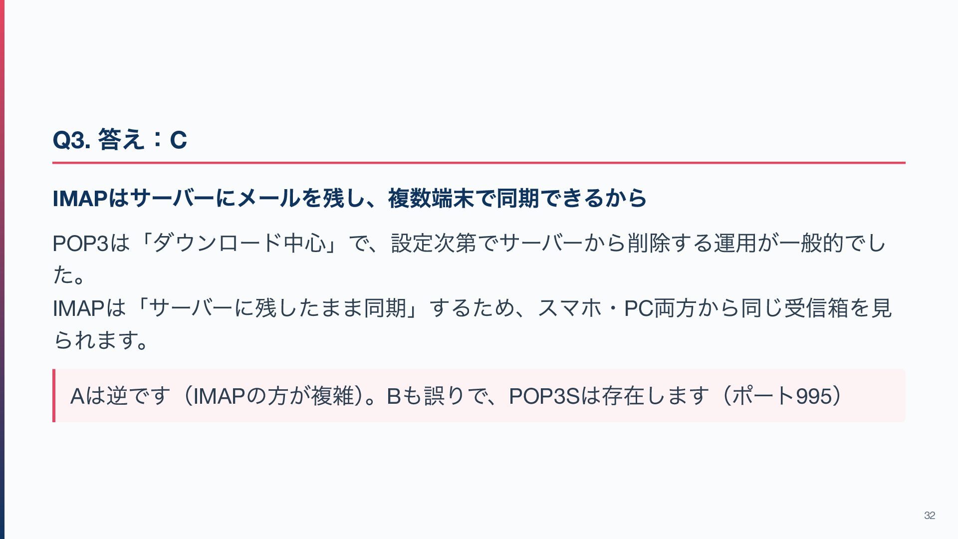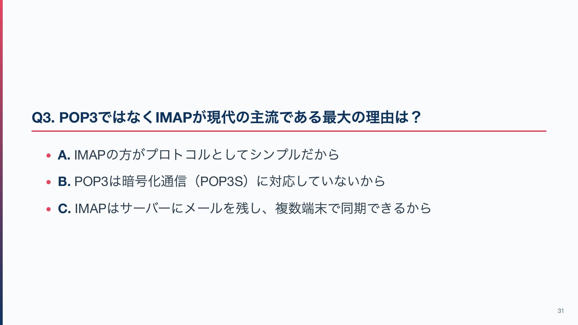 13. Q3. POP3 ではなくIMAP が現代の主流である最大の理由は? A. IMAP の方がプロトコルとしてシンプルだから B. POP3 は暗号化通信(POP3S