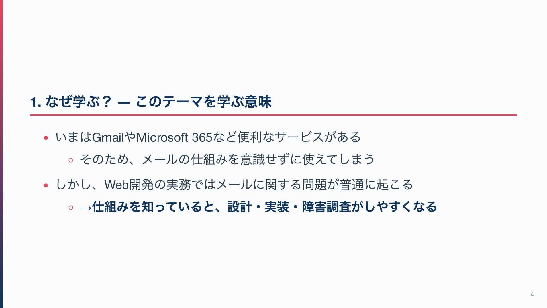 2. 1. なぜ学ぶ? ― このテーマを学ぶ意味 いまはGmail やMicrosoft 365 など便利なサービスがある そのため、メールの仕組みを意識せずに使えてしまう しかし、Web