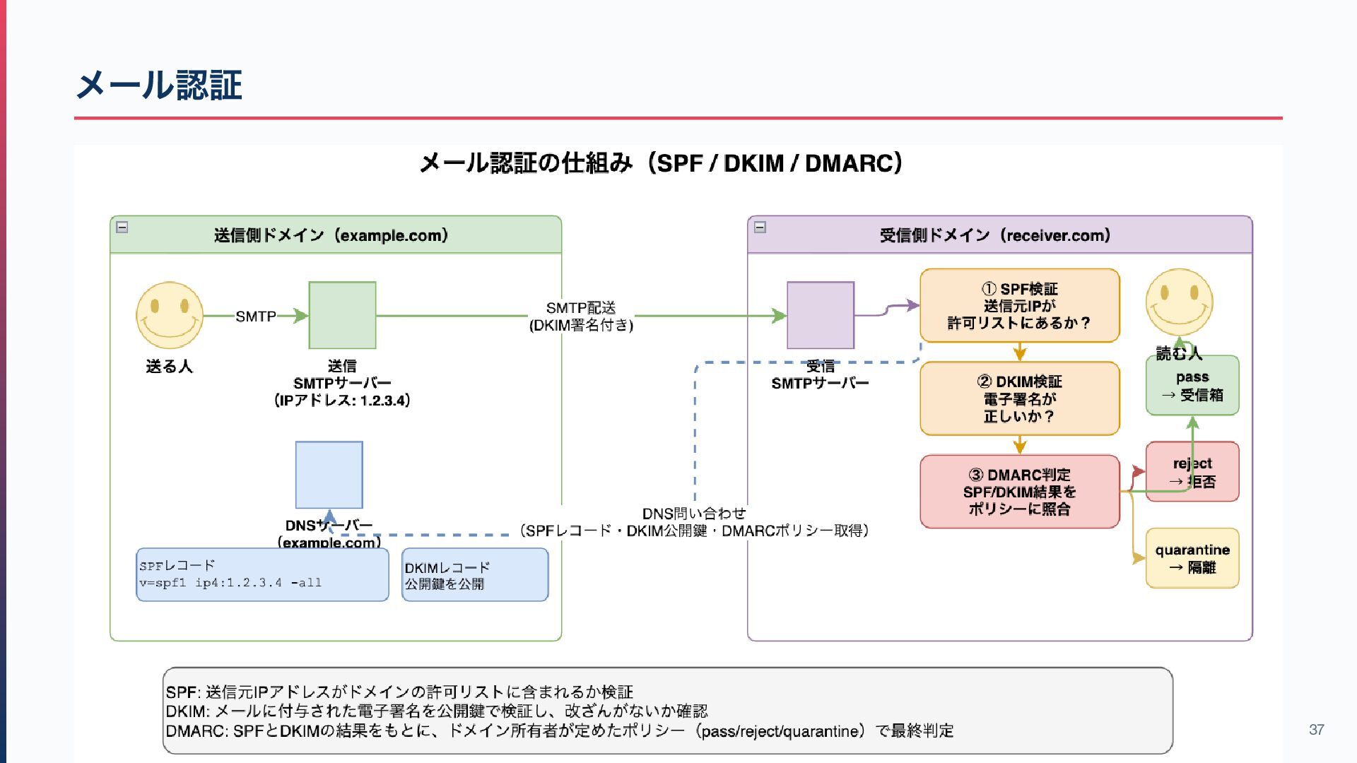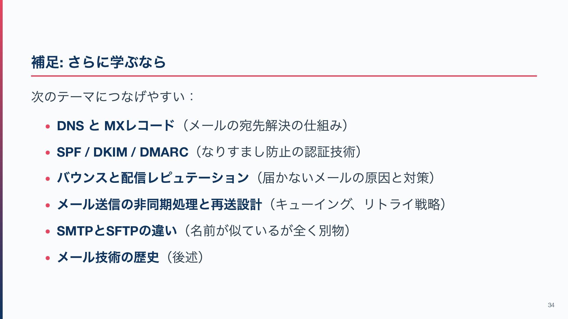 / DMARC (なりすまし防止の認証技術) バウンスと配信レピュテーション(届かないメールの原因と対策) メール送信の非同期処理と再送設計(キューイング、リトライ戦略) SMTP とSFTP の違い(名前が似ているが全く別物) メール技術の歴史(後述) 34