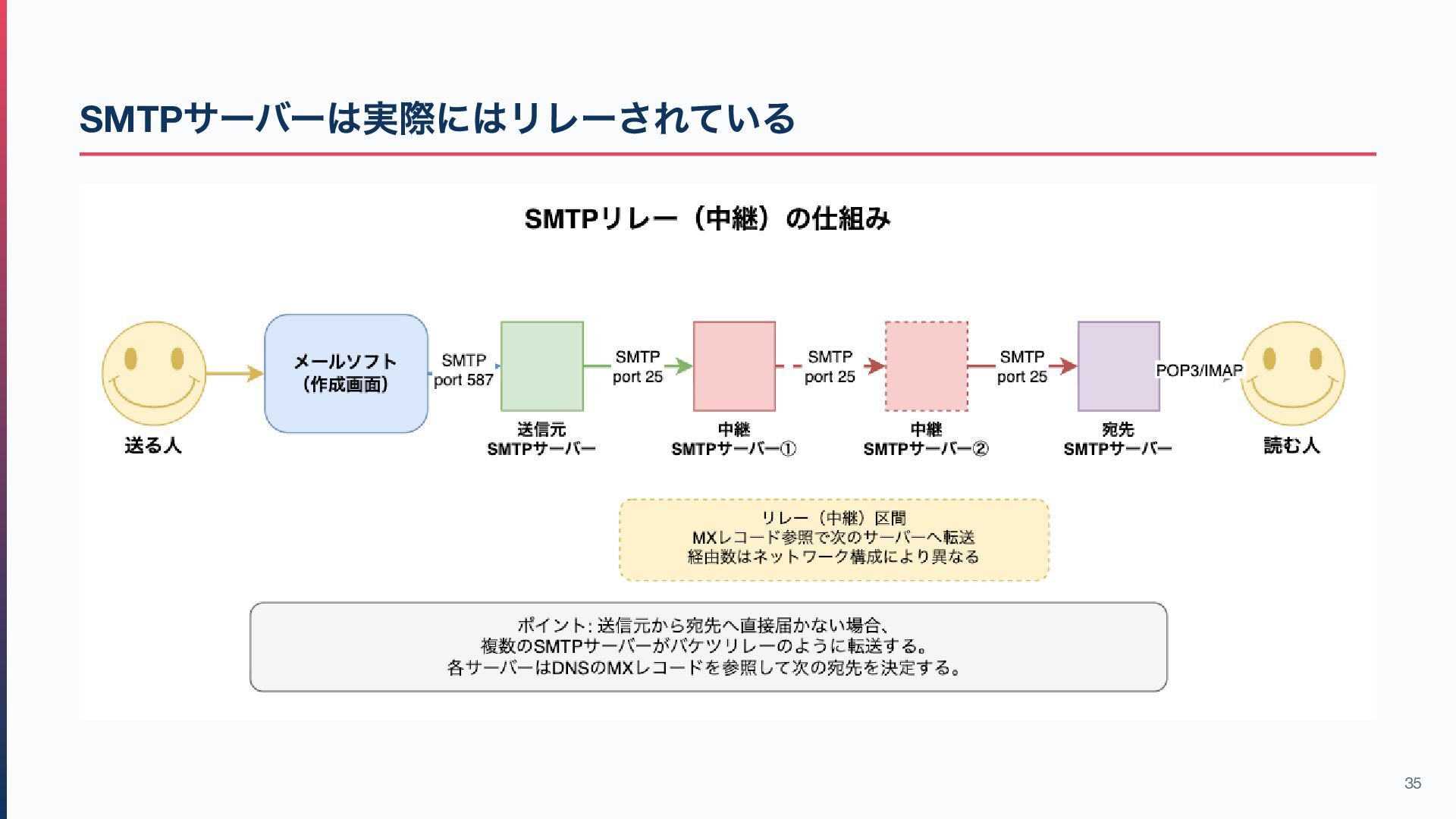 8. 3. メール関連の主なポート番号 プロトコル ポート 用途 今の立ち位置 SMTP 25 サーバー間配送 サーバー間専用