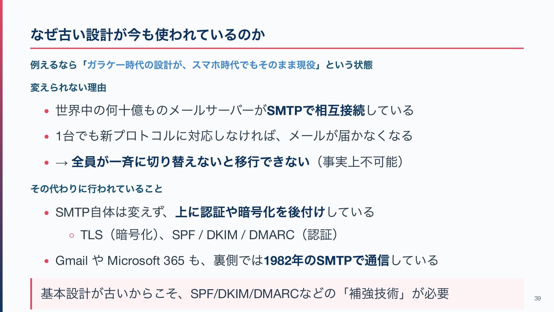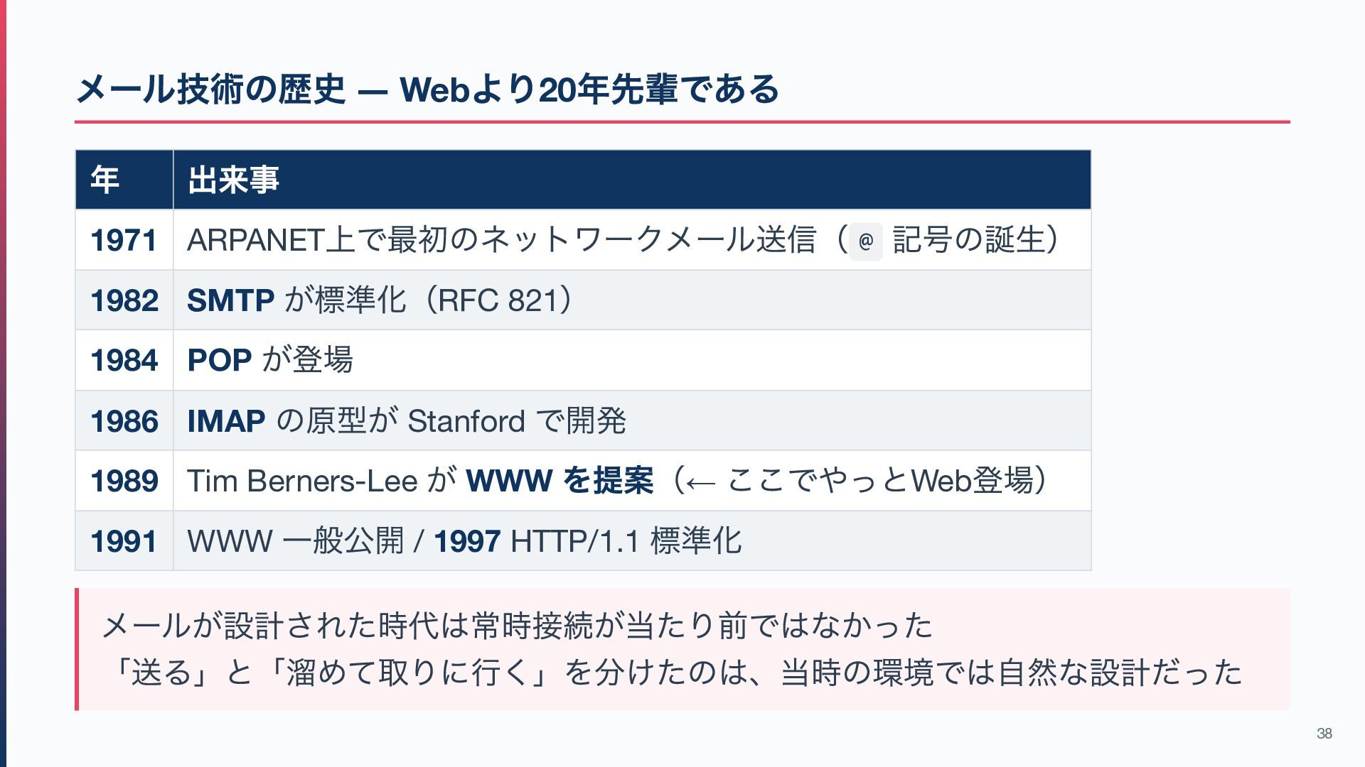 @ 記号の誕生) 1982 SMTP が標準化(RFC 821 ) 1984 POP が登場 1986 IMAP の原型が Stanford で開発 1989 Tim Berners-Lee が WWW を提案(← ここでやっとWeb 登場) 1991 WWW 一般公開 / 1997 HTTP/1.1 標準化 メールが設計された時代は常時接続が当たり前ではなかった 「送る」と「溜めて取りに行く」を分けたのは、当時の環境では自然な設計だった 38