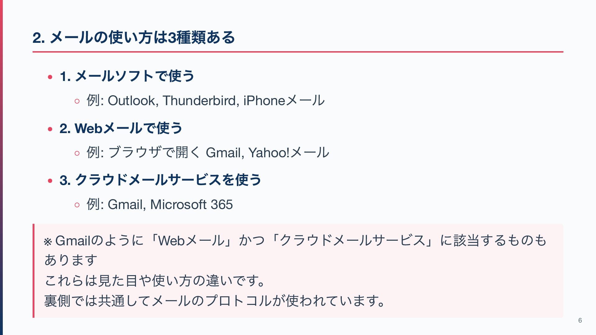 2. Web メールで使う 例: ブラウザで開く Gmail, Yahoo! メール 3. クラウドメールサービスを使う 例: Gmail, Microsoft 365 ※ Gmail のように「Web メール」かつ「クラウドメールサービス」に該当するものも あります これらは見た目や使い方の違いです。 裏側では共通してメールのプロトコルが使われています。 6