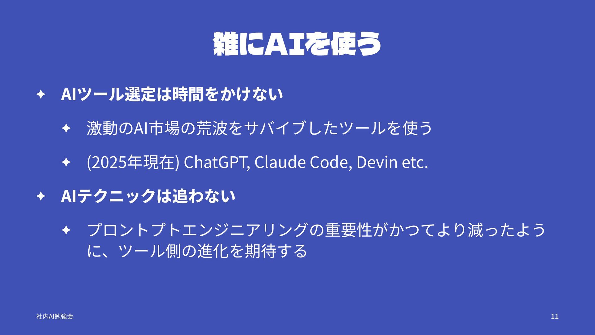 Devin etc. ✦ AIテクニックは追わない ✦ プロントプトエンジニアリングの重要性がかつてより減ったよう に、ツール側の進化を期待する 社内AI勉強会 !!