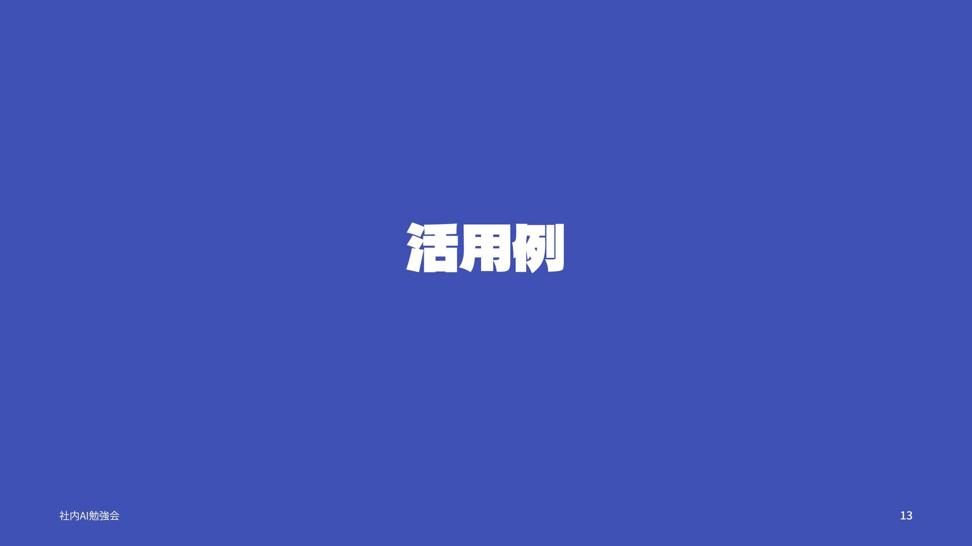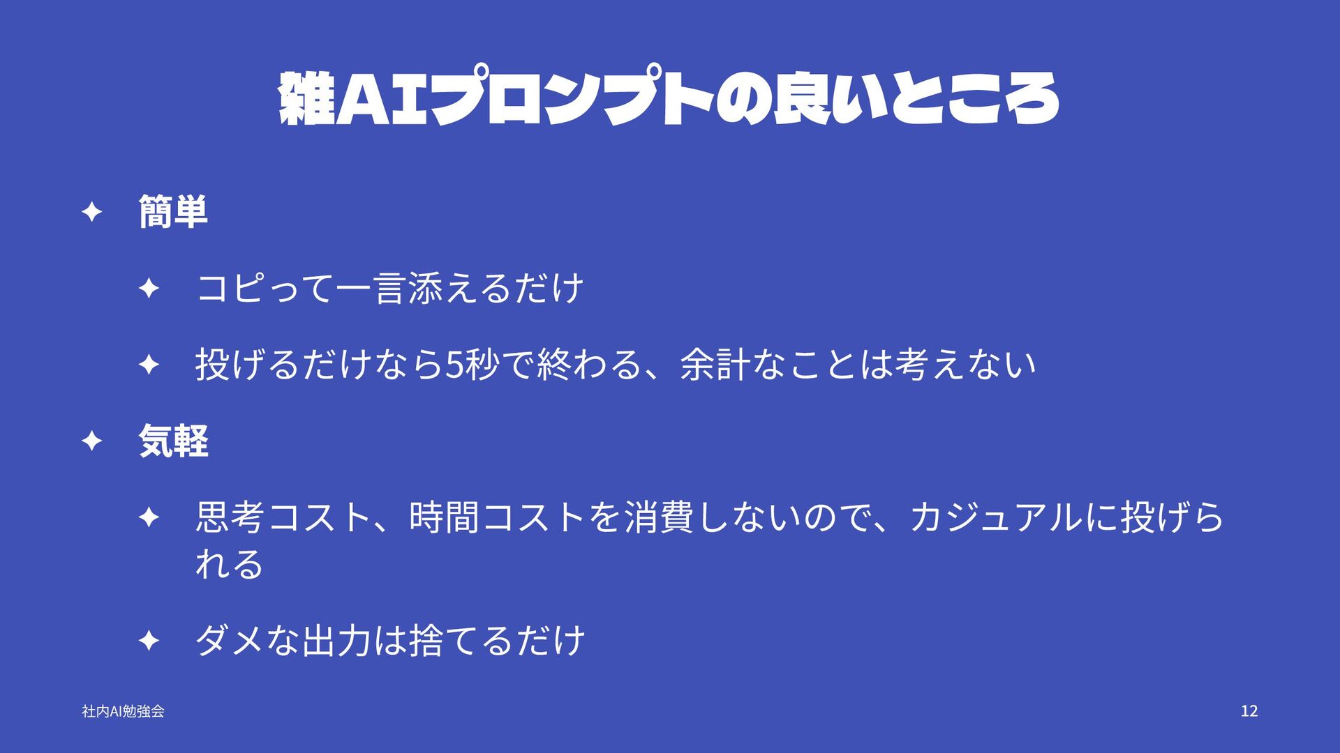 思考コスト、時間コストを消費しないので、カジュアルに投げら れる ✦ ダメな出⼒は捨てるだけ 社内AI勉強会 !"