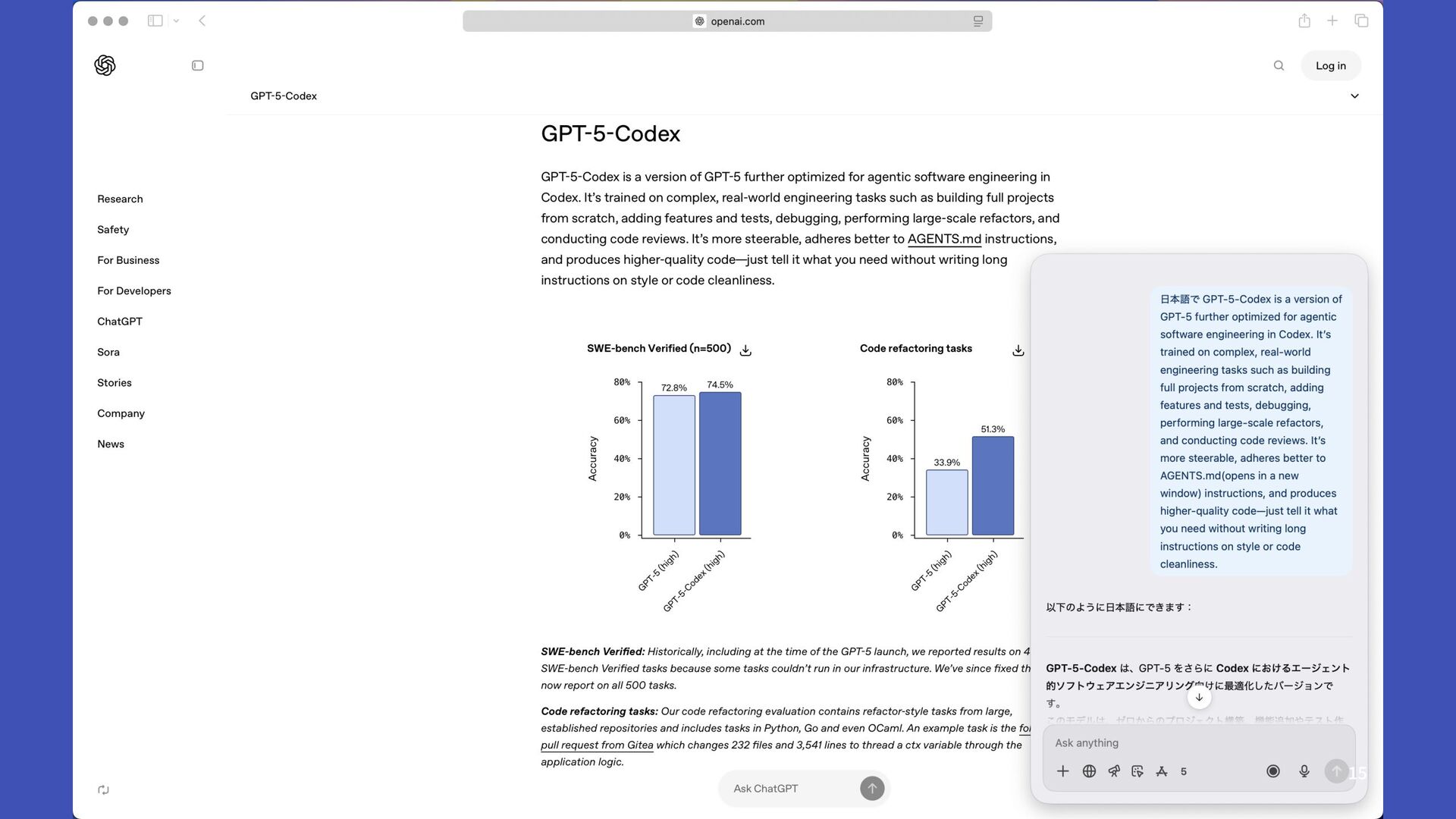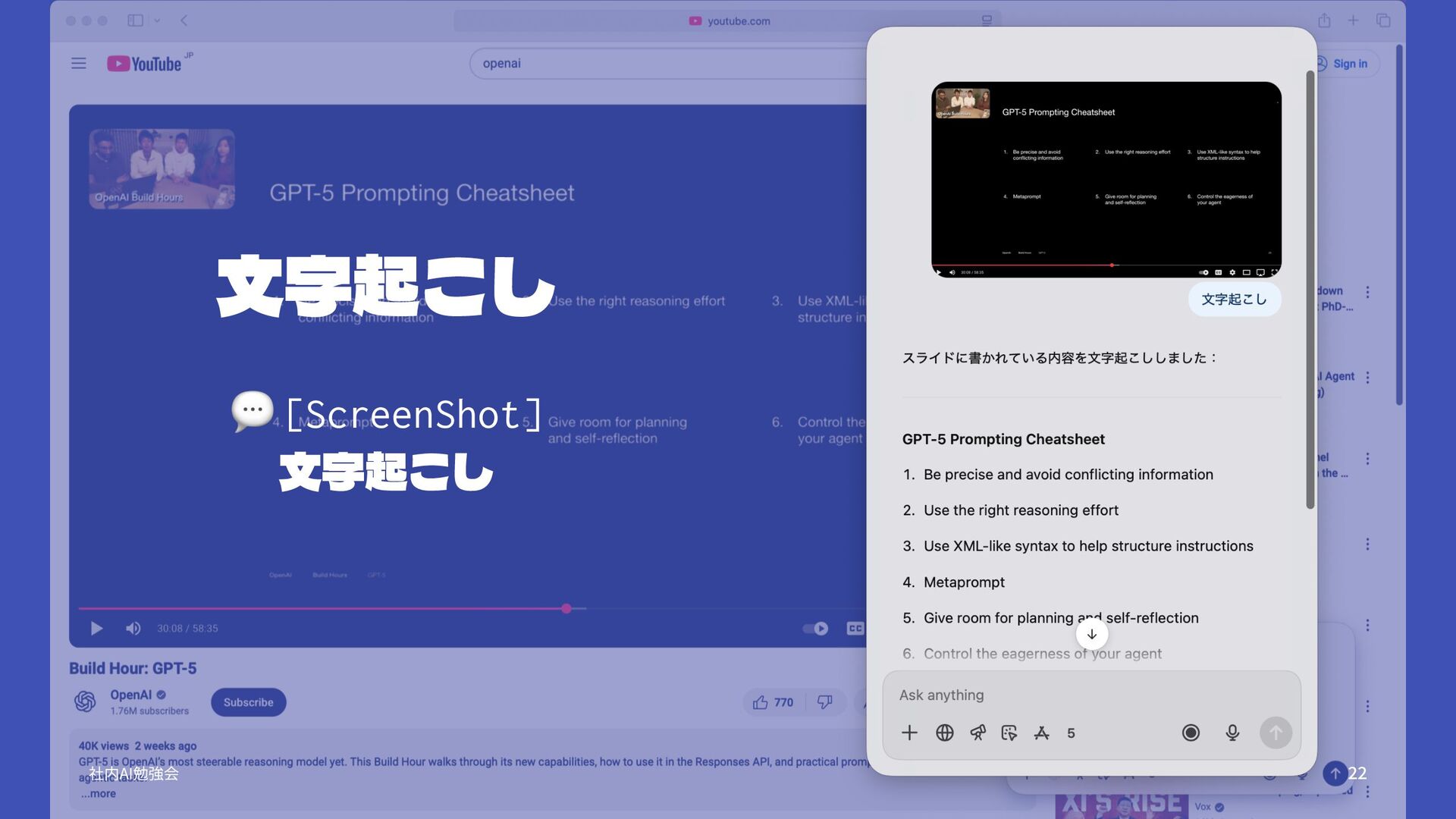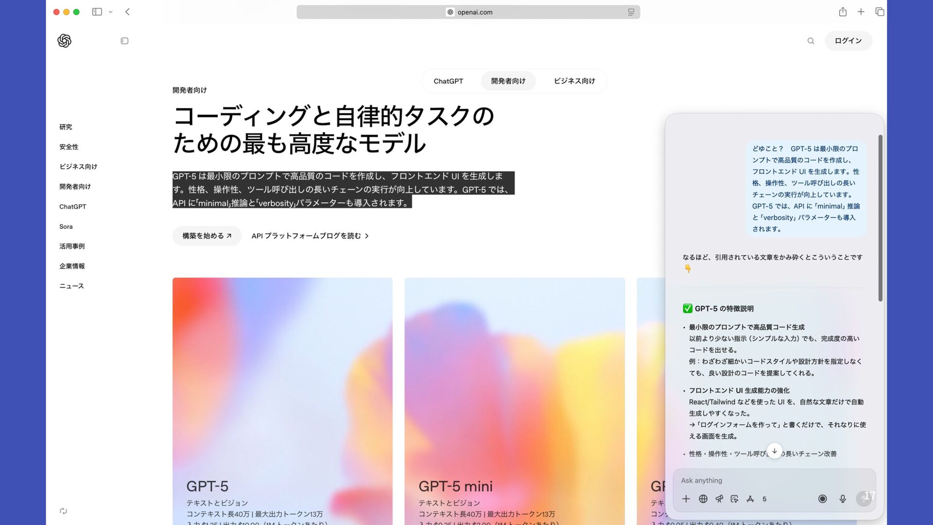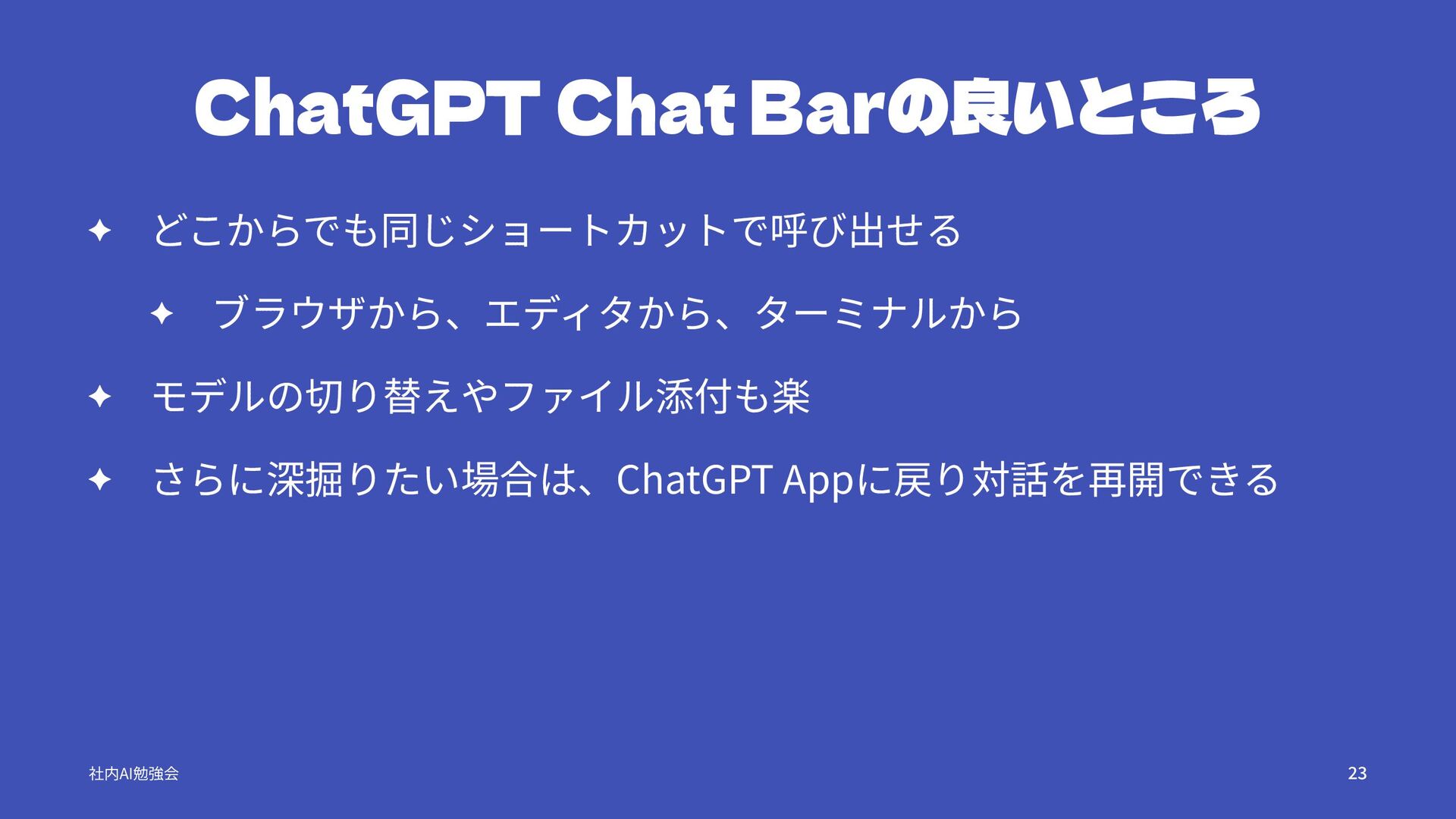 ChatGPT Chat Barの良いところ ✦ どこからでも同じショートカットで呼び出せる ✦ ブラウザから、エディタから、ターミナルから ✦ モデルの切り替えやファイル添付も楽 ✦