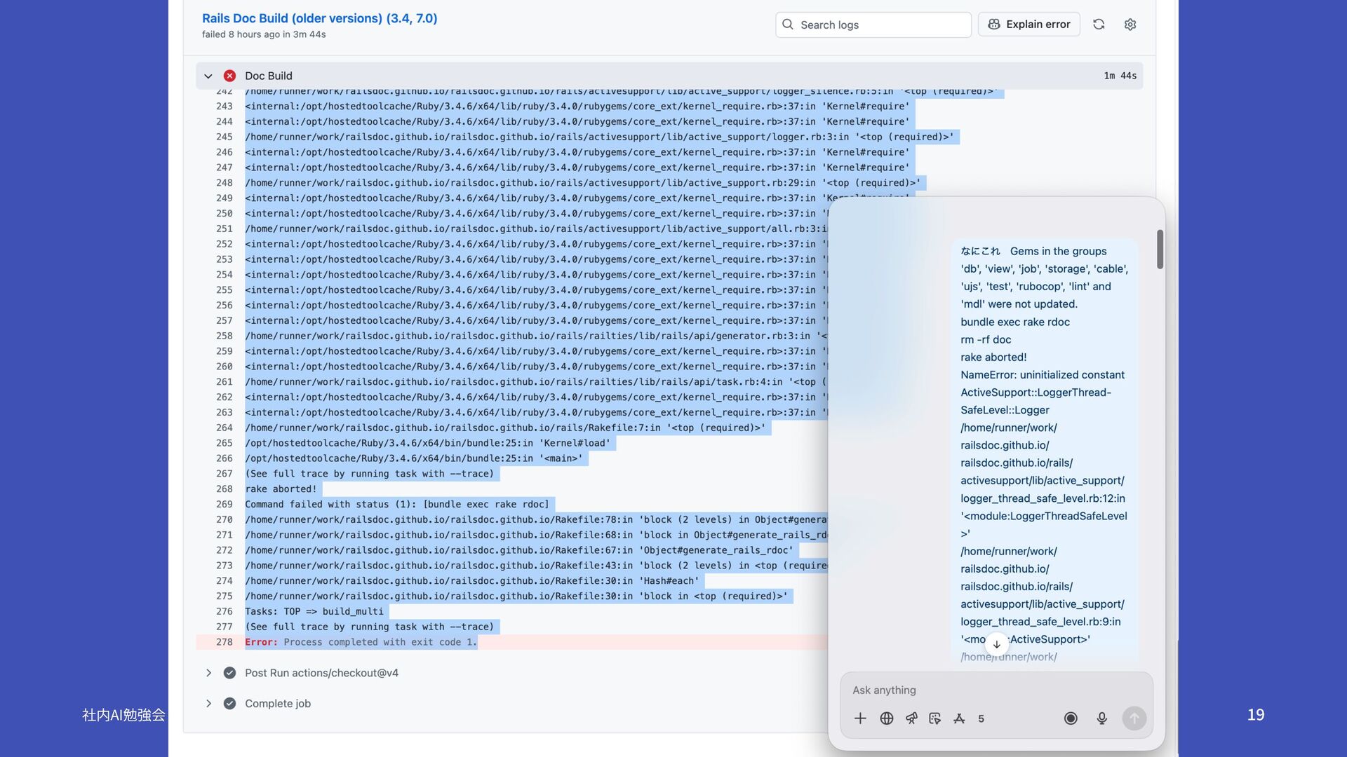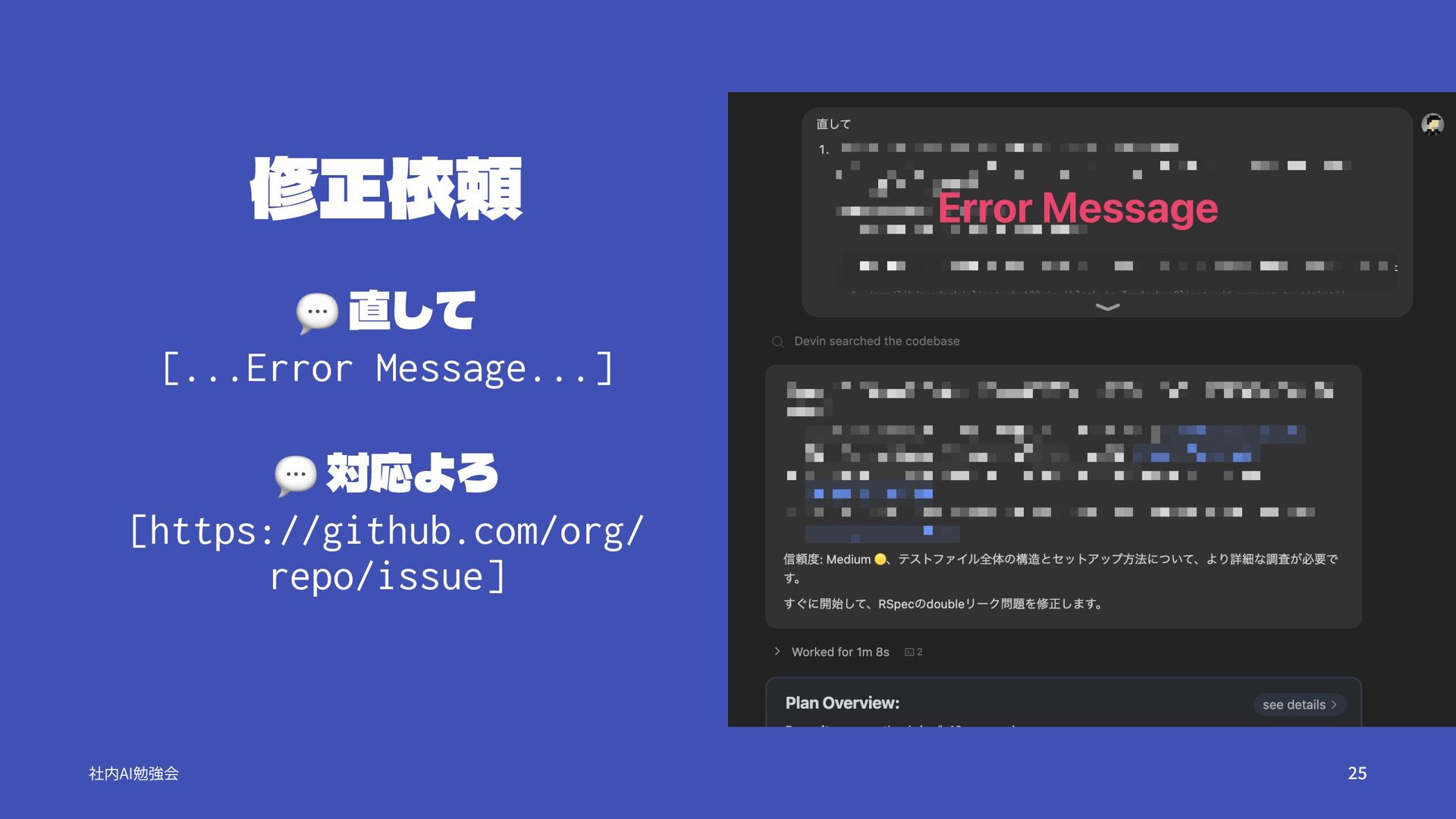 修正依頼 ! 直して [...Error Message...] ! 対応よろ [https://github.com/org/ repo/issue] 社内AI勉強会