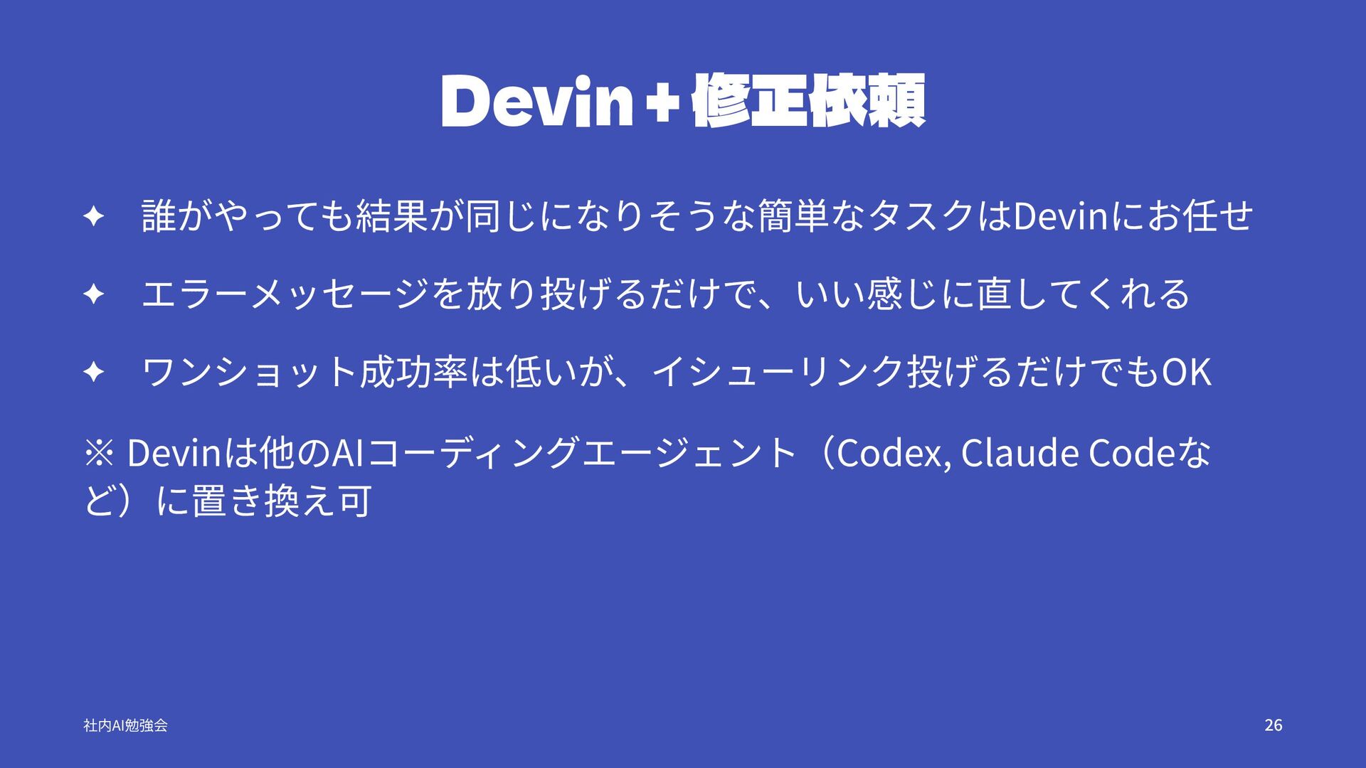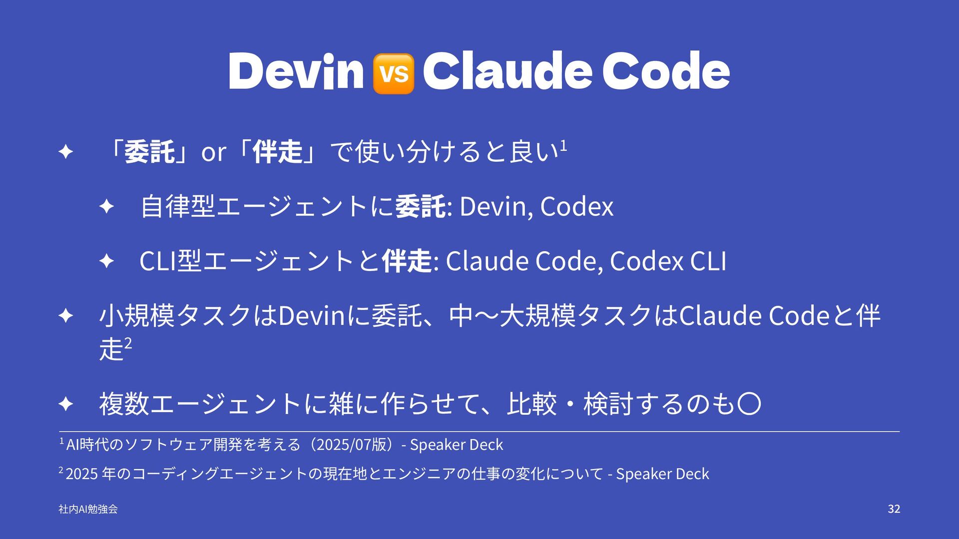 Devinは他のAIコーディングエージェント(Codex, Claude Codeな ど)に置き換え可 社内AI勉強会 !"