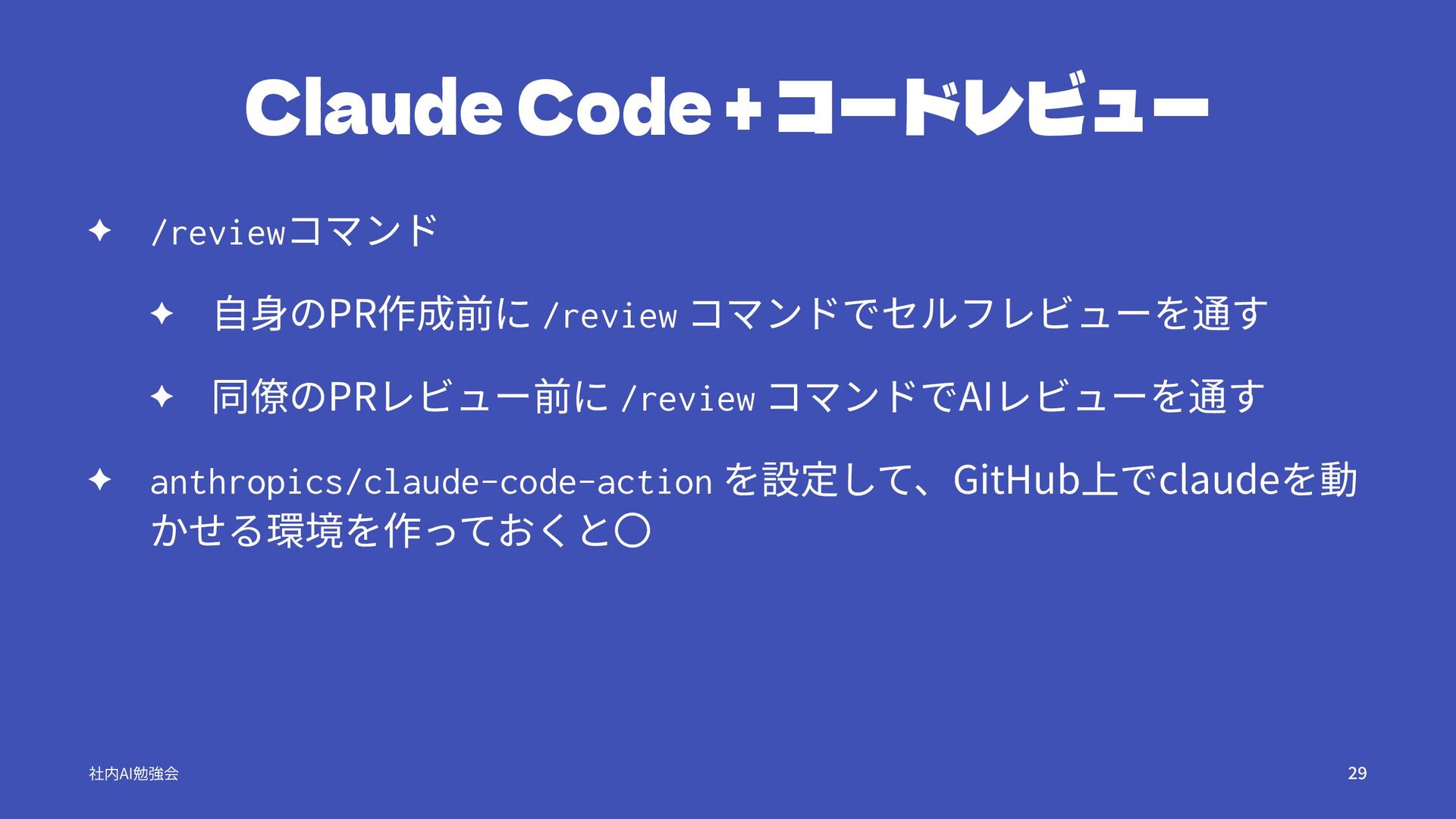 ✦ 同僚のPRレビュー前に /review コマンドでAIレビューを通す ✦ anthropics/claude-code-action を設定して、GitHub上でclaudeを動 かせる環境を作っておくと〇 社内AI勉強会 !"