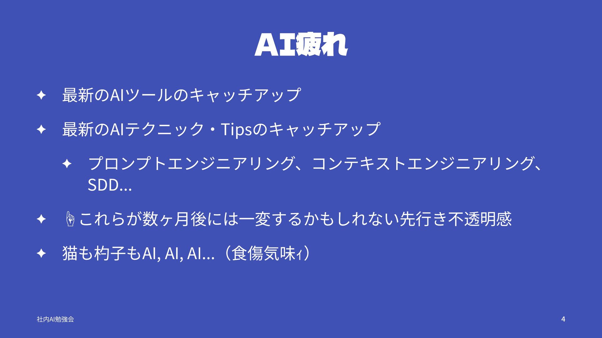 AI疲れ ✦ 最新のAIツールのキャッチアップ ✦ 最新のAIテクニック‧Tipsのキャッチアップ ✦ プロンプトエンジニアリング、コンテキストエンジニアリング、 SDD... ✦ ☝これらが数ヶ⽉後には⼀変するかもしれない先⾏き不透明感