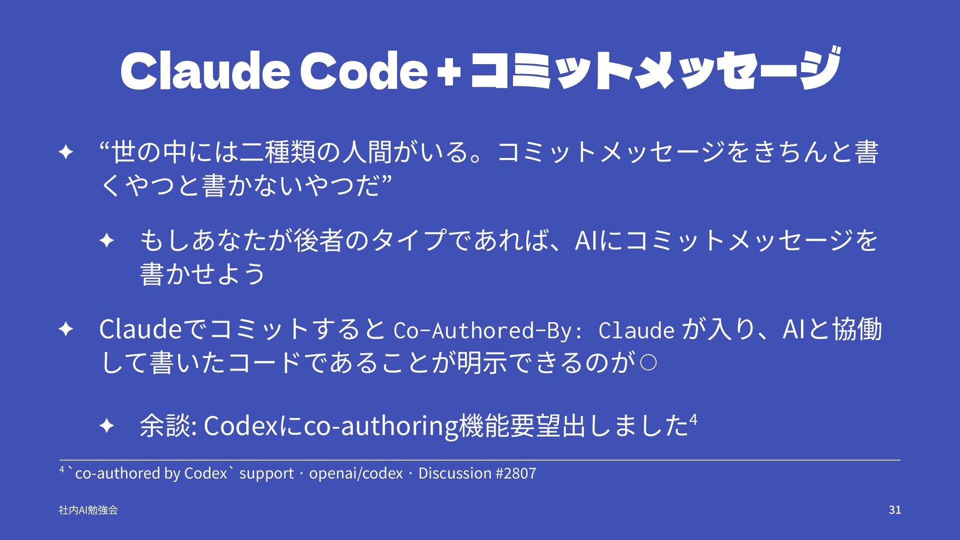 ✦ Claudeでコミットすると Co-Authored-By: Claude が⼊り、AIと協働 して書いたコードであることが明⽰できるのが ✦ 余談: Codexにco-authoring機能要望出しました{ ! `co-authored by Codex` support · openai/codex · Discussion #:;<= 社内AI勉強会 !"