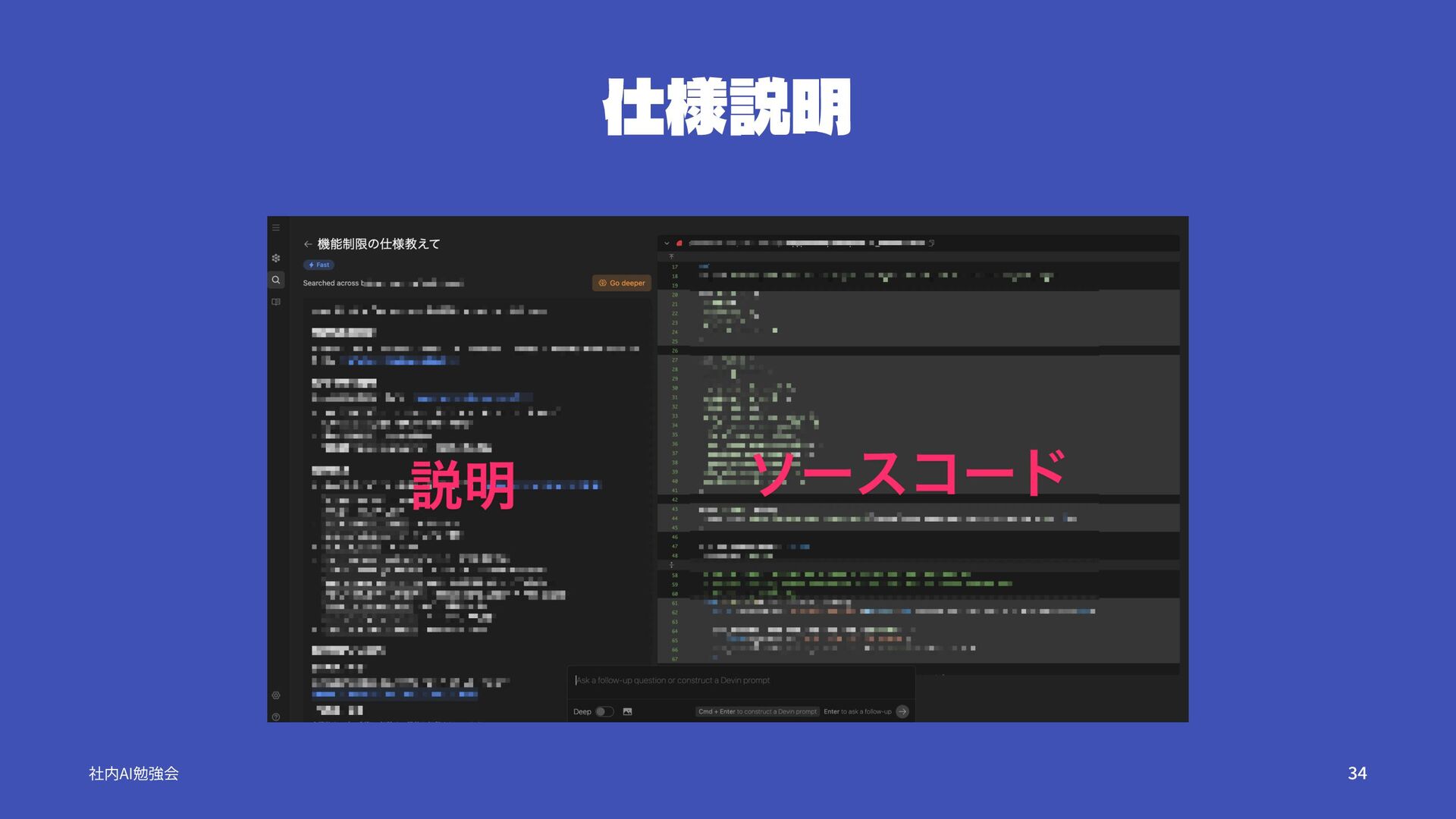 ✦ 説明の論拠としてソースコードと合わせて表⽰してくれるので、説得 ⼒◦ ✦ DeepWiki とのコンボも強⼒ 社内AI勉強会 !"