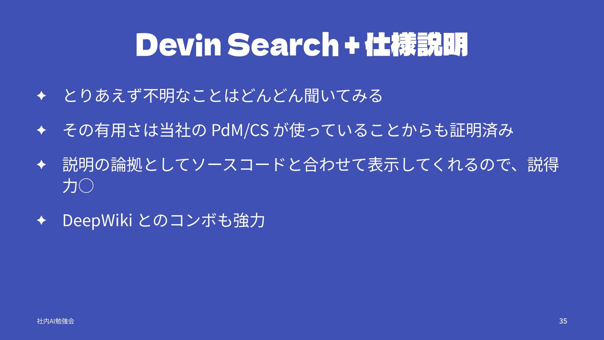 Devin Search + 仕様説明 ✦ とりあえず不明なことはどんどん聞いてみる ✦ その有⽤さは当社の PdM/CS が使っていることからも証明済み