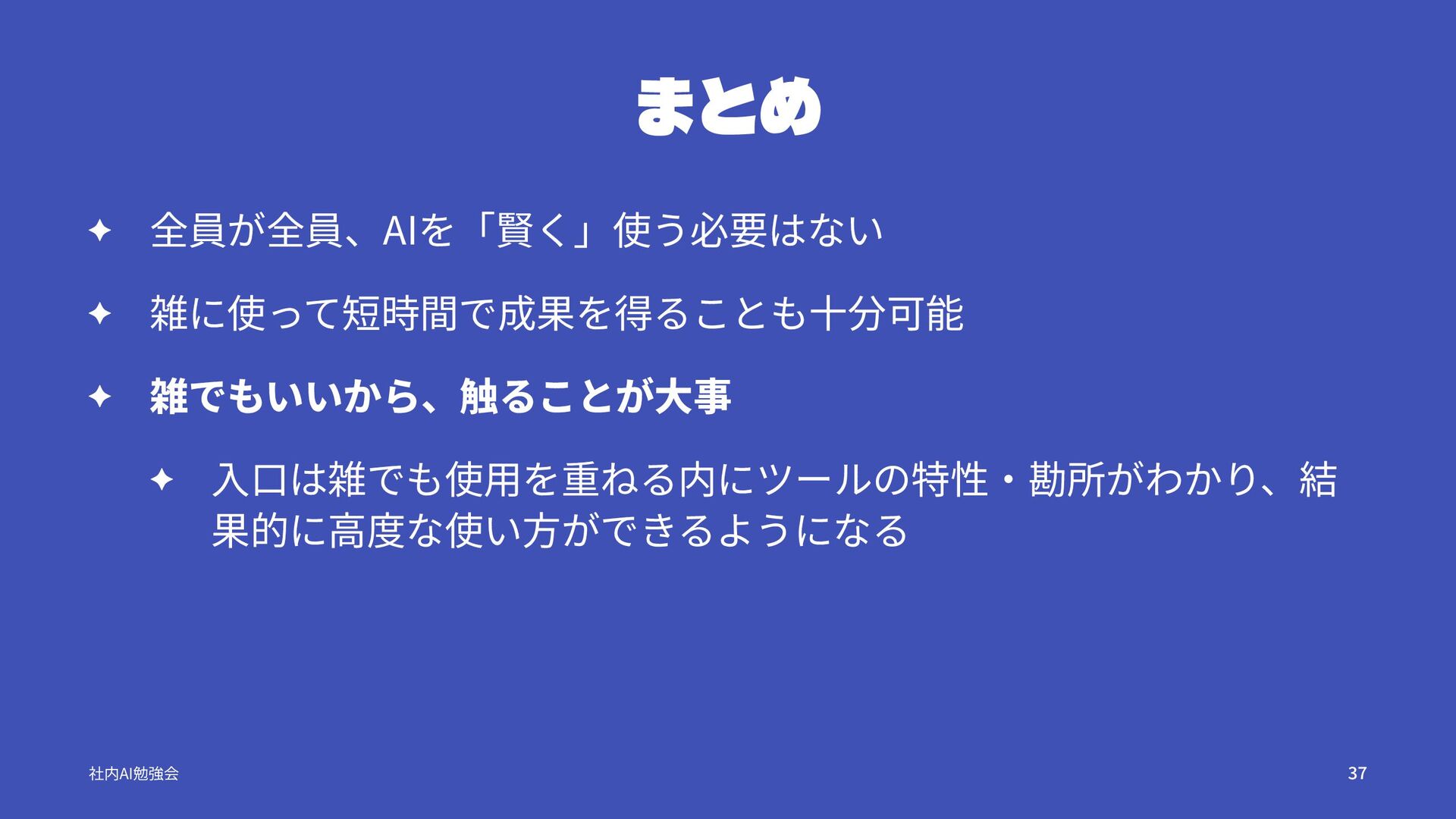 まとめ ✦ 全員が全員、AIを「賢く」使う必要はない ✦ 雑に使って短時間で成果を得ることも⼗分可能 ✦ 雑でもいいから、触ることが⼤事 ✦ ⼊⼝は雑でも使⽤を重ねる内にツールの特性‧勘所がわかり、結 果的に⾼度な使い⽅ができるようになる