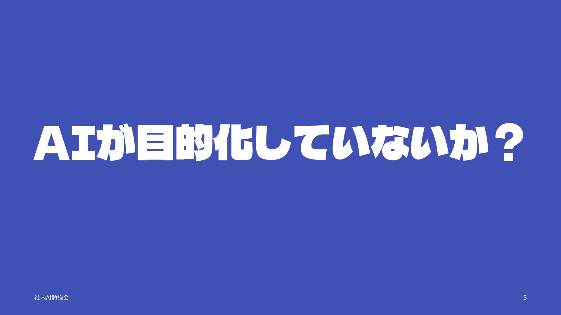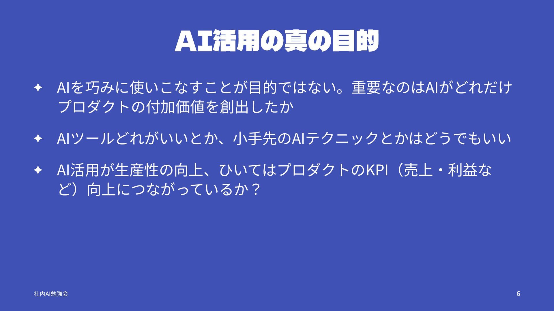 AI活用の真の目的 ✦ AIを巧みに使いこなすことが⽬的ではない。重要なのはAIがどれだけ プロダクトの付加価値を創出したか ✦ AIツールどれがいいとか、⼩⼿先のAIテクニックとかはどうでもいい ✦ AI活⽤が⽣産性の向上、ひいてはプロダクトのKPI(売上‧利益な ど)向上につながっているか? 社内AI勉強会