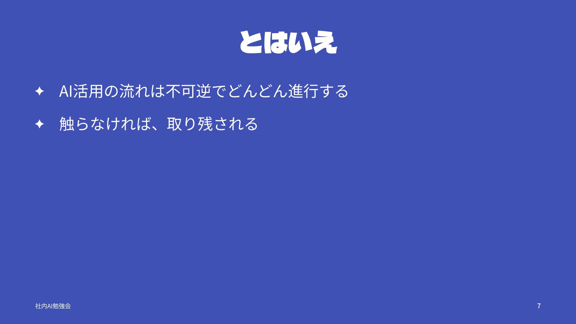 とはいえ ✦ AI活⽤の流れは不可逆でどんどん進⾏する ✦ 触らなければ、取り残される 社内AI勉強会 !