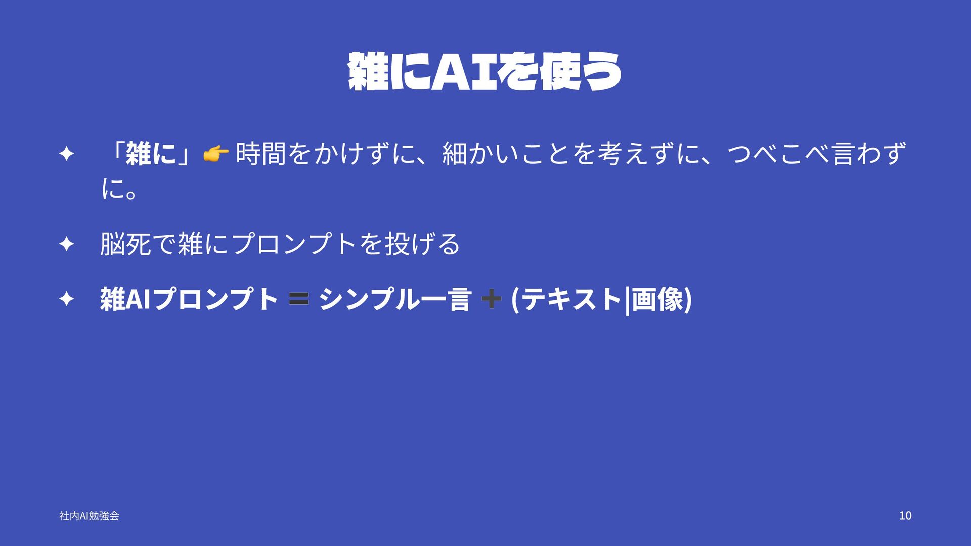 雑にAIを使う ✦ 「雑に」 ! 時間をかけずに、細かいことを考えずに、つべこべ⾔わず に。 ✦ 脳死で雑にプロンプトを投げる ✦ 雑AIプロンプト