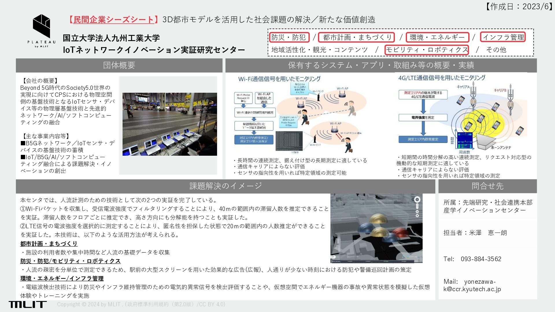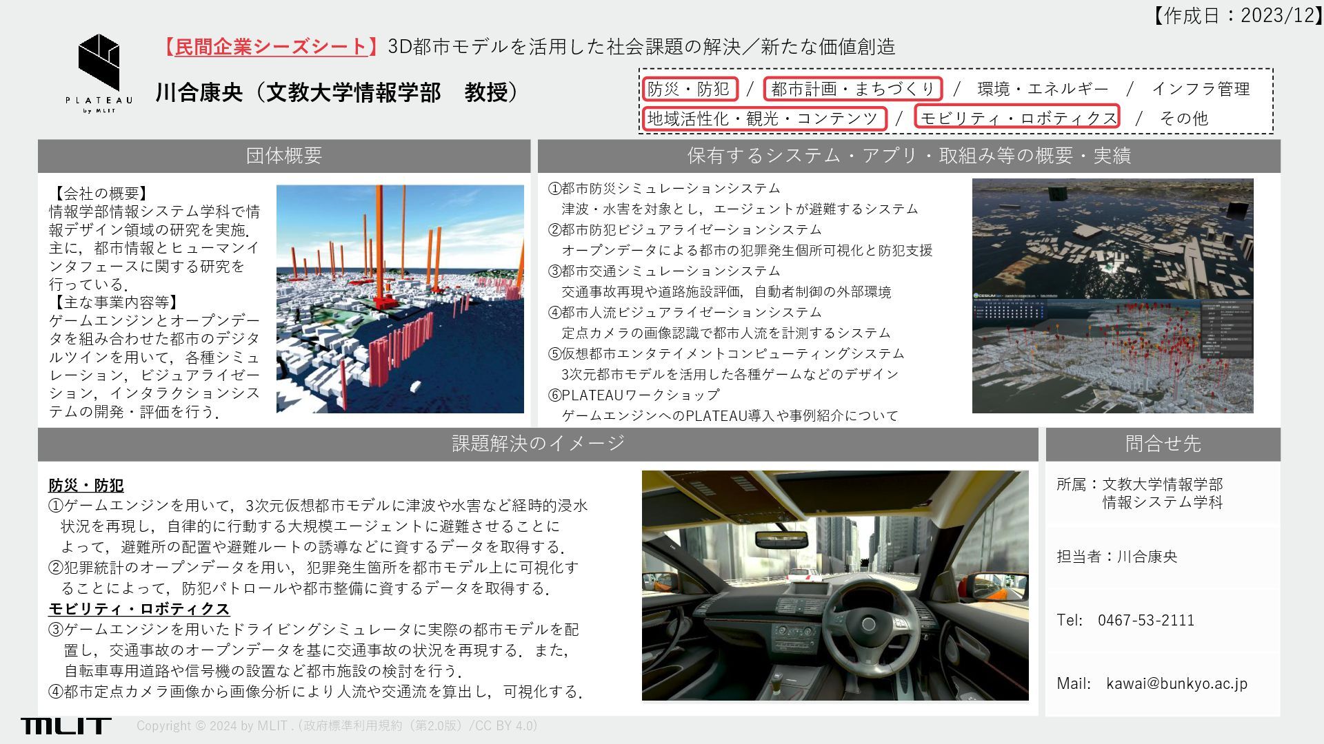 [email protected] 【民間企業シーズシート】3D都市モデルを活用した社会課題の解決/新たな価値創造 株式会社大林組 団体概要 保有するシステム・アプリ・取組み等の概要・実績 課題解決のイメージ 【会社の概要】 創 業 1892(明治25)年1月 資本金 577.52億円 従業員数 9,134名(2023年3月末現在) 【主な事業内容等】 国内外建設工事、地域開発・都 市開発・その他建設に関する事 業、及びこれらに関するエンジ ニアリング・マネージメント・ コンサルティング業務の受託、 不動産事業ほか 防災・防犯 / 都市計画・まちづくり / 環境・エネルギー / インフラ管理 地域活性化・観光・コンテンツ / モビリティ・ロボティクス / その他 問合せ先 【作成日:2024/1】 都市計画・まちづくり / 環境・エネルギー ①建築・都市計画のためのPLATEAUモデル連携の簡易化 ・任意半径の形状取得(bldg+brid, dem, tran, veg) ・部位別の形状取得(Wall, Roof, Ground, Window, Door, BuildingInstallation) ②建築・都市計画の総合評価を効率化 ・風環境評価(詳細風予測)、AIによる簡易風予測 ・ガラス面からの反射集熱評価、光害評価 ・太陽熱の影響評価(クールスポット、太陽光発電ポテンシャルなど) ・開放感、眺望評価 ③行政手続きの自動化(将来) ・環境アセスメント評価の自動認証による効率的な社会システムへ 都市環境を対象としたクラウド解析ツール群『PLATEAU Tools』 【PLATEAU Tools】 様々な都市環境評価を最大3つの入力だけで全 自動解析する、クラウド解析ツール群 【特徴】 ・自然言語からの直感的な物理情報取得 ・エビデンスに基づいたシミュレーション ・オープンソース、オープンデータ連携 ・Dockerによる解析システムの標準化 ・VTKによる解析データの標準化 ・クラウドHPCによる高速化(数十~数千倍) ・シミュレーションのAI化への取り組み 【実績】 PLATEAU AWARD2022 マッドデータサイエンティスト賞