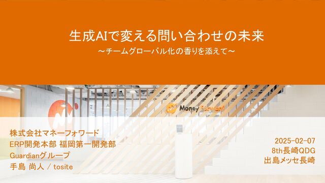 生成AIで変える問い合わせの未来 〜チームグローバル化の香りを添えて〜 株式会社マネーフォワード ERP開発本部 福岡第一開発部 Guardianグループ 手島 尚人 / tosite