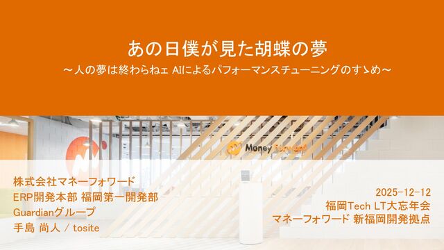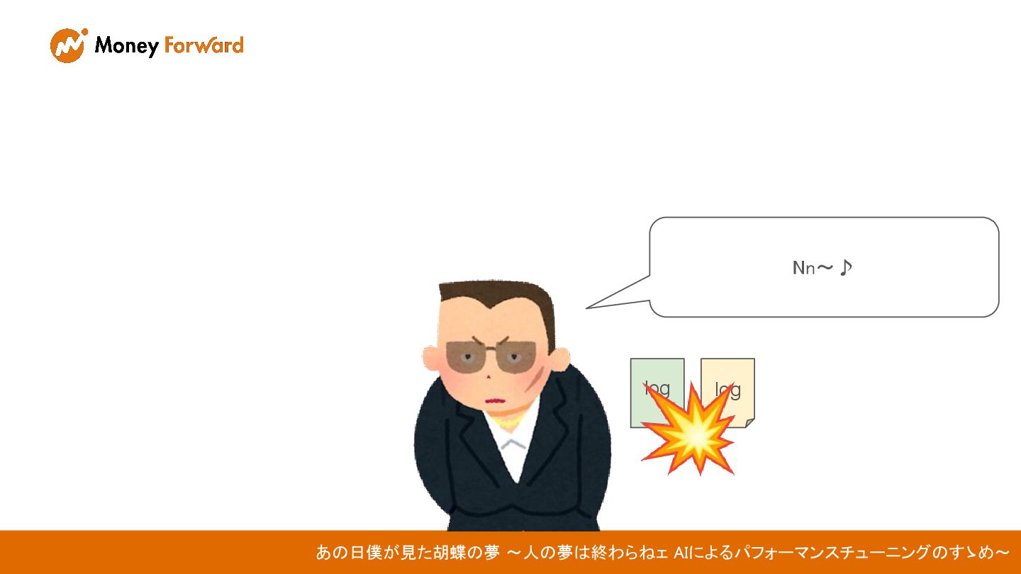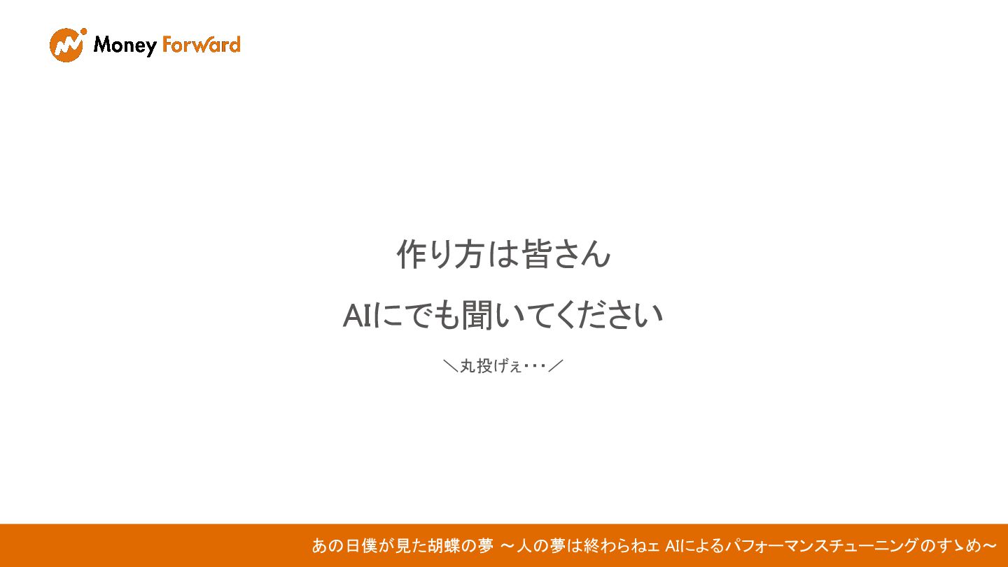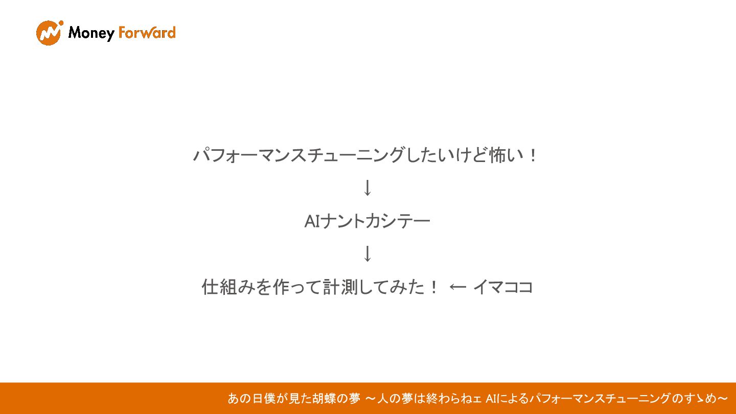 あの日僕が見た胡蝶の夢 〜人の夢は終わらねェ AIによるパフォーマンスチューニングのすゝめ〜 株式会社マネーフォワード ERP開発本部 福岡第一開発部 Guardianグループ 手島 尚人 /