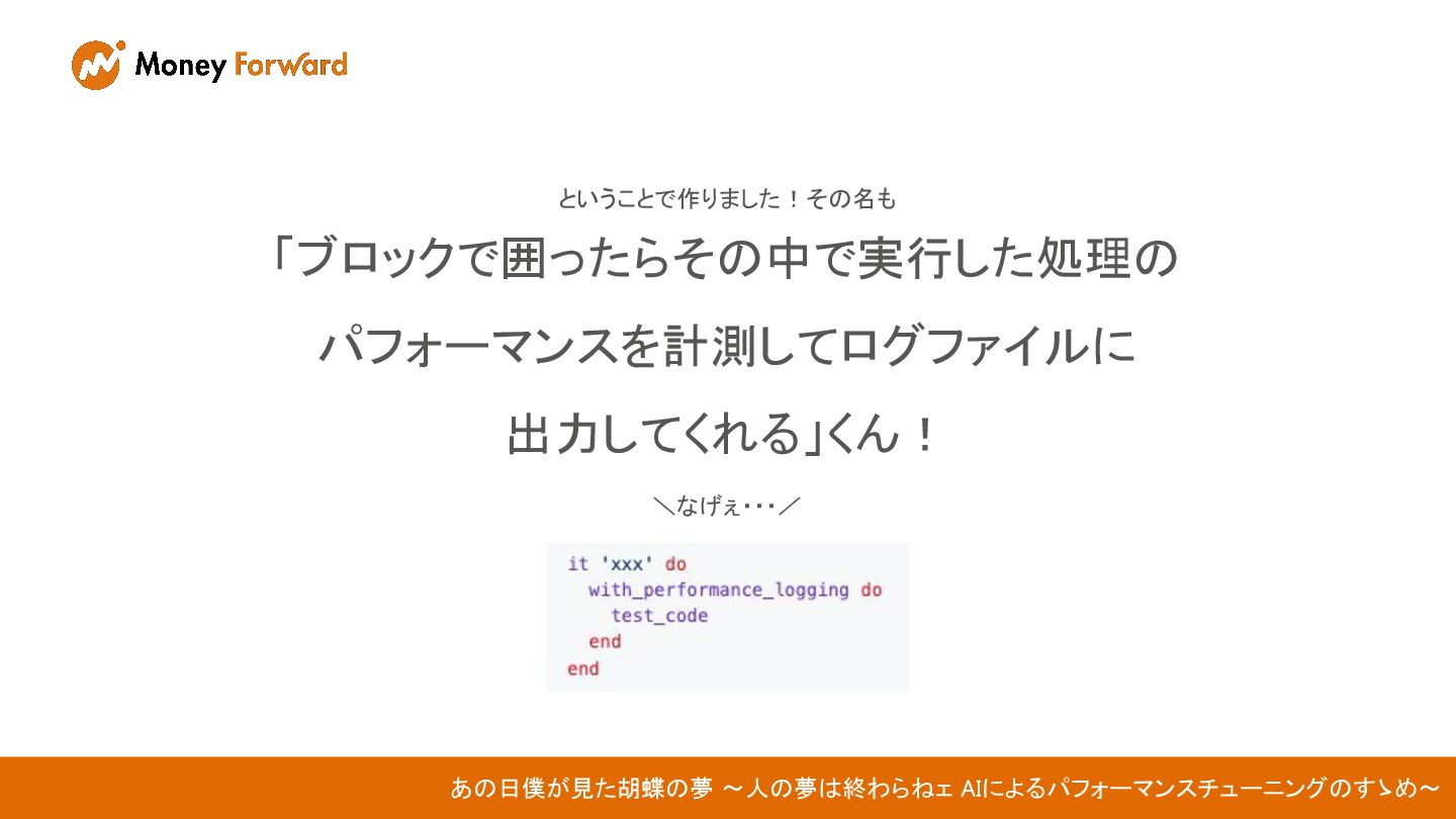 ということで作りました!その名も 「ブロックで囲ったらその中で実行した処理の パフォーマンスを計測してログファイルに 出力してくれる」くん! \なげぇ・・・/ あの日僕が見た胡蝶の夢 〜人の夢は終わらねェ AIによるパフォーマンスチューニングのすゝめ〜