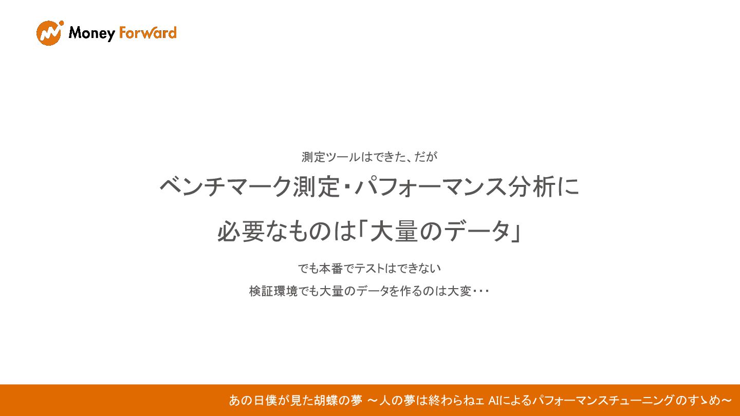 測定ツールはできた、だが ベンチマーク測定・パフォーマンス分析に 必要なものは「大量のデータ」 でも本番でテストはできない 検証環境でも大量のデータを作るのは大変・・・ あの日僕が見た胡蝶の夢 〜人の夢は終わらねェ AIによるパフォーマンスチューニングのすゝめ〜