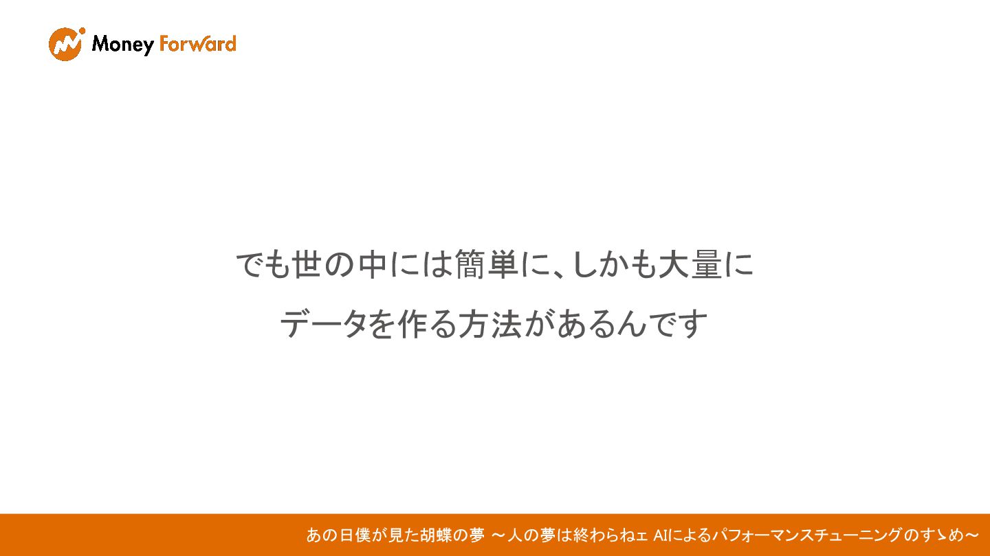 でも世の中には簡単に、しかも大量に データを作る方法があるんです あの日僕が見た胡蝶の夢 〜人の夢は終わらねェ AIによるパフォーマンスチューニングのすゝめ〜