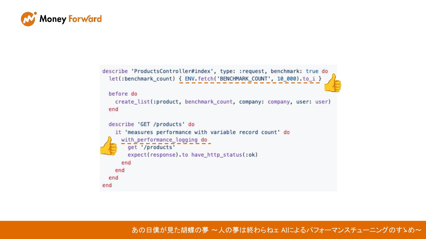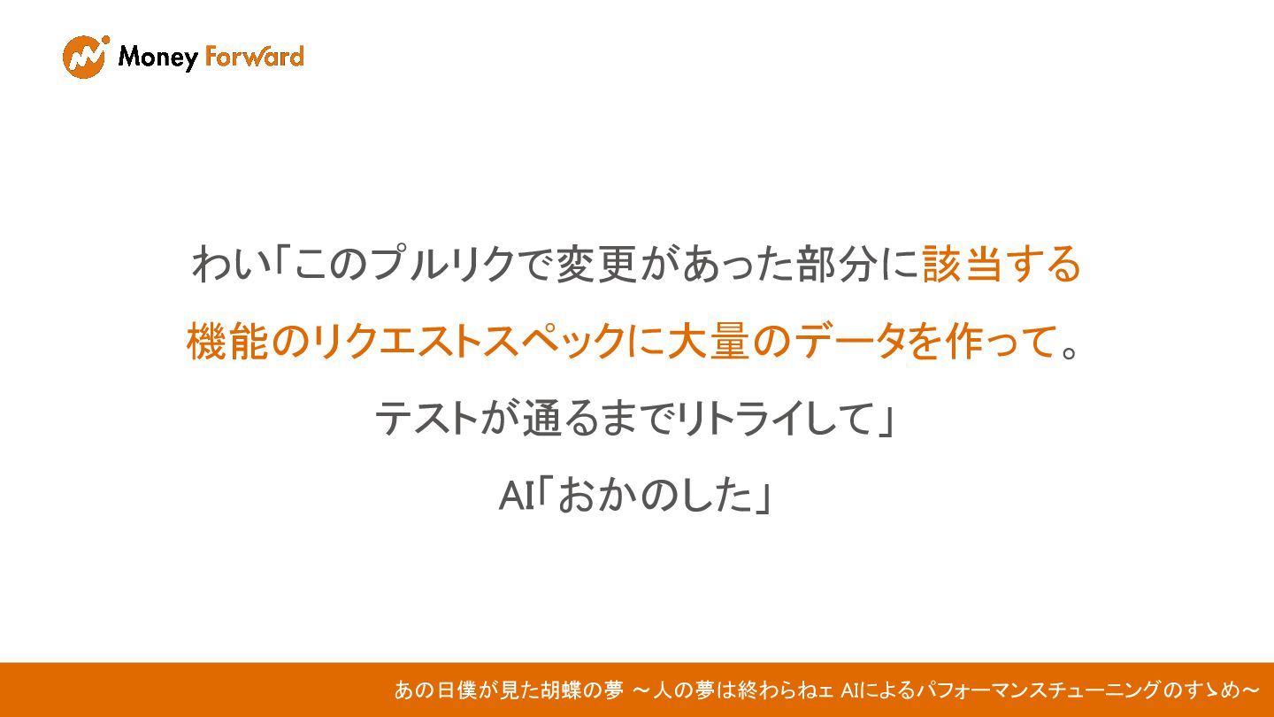 わい「このプルリクで変更があった部分に該当する 機能のリクエストスペックに大量のデータを作って。 テストが通るまでリトライして」 AI「おかのした」 あの日僕が見た胡蝶の夢 〜人の夢は終わらねェ AIによるパフォーマンスチューニングのすゝめ〜