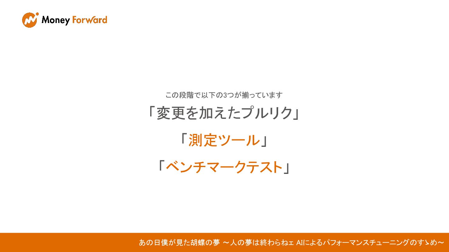 この段階で以下の3つが揃っています 「変更を加えたプルリク」 「測定ツール」 「ベンチマークテスト」 あの日僕が見た胡蝶の夢 〜人の夢は終わらねェ AIによるパフォーマンスチューニングのすゝめ〜