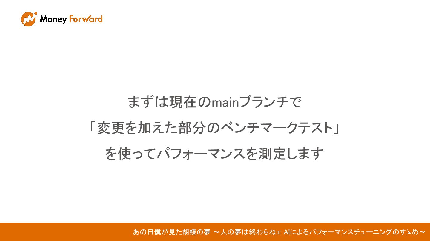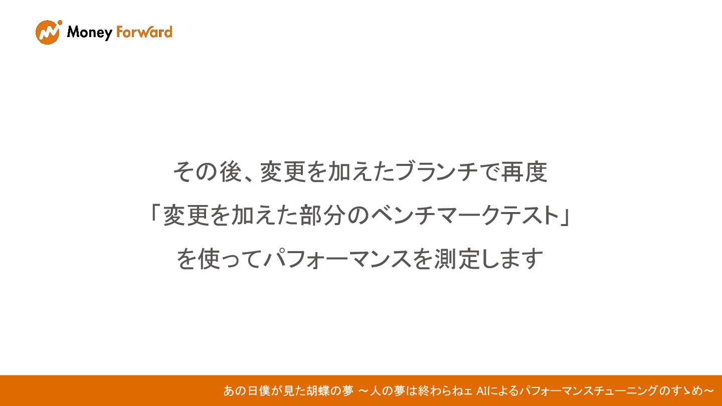 その後、変更を加えたブランチで再度 「変更を加えた部分のベンチマークテスト」 を使ってパフォーマンスを測定します あの日僕が見た胡蝶の夢 〜人の夢は終わらねェ AIによるパフォーマンスチューニングのすゝめ〜