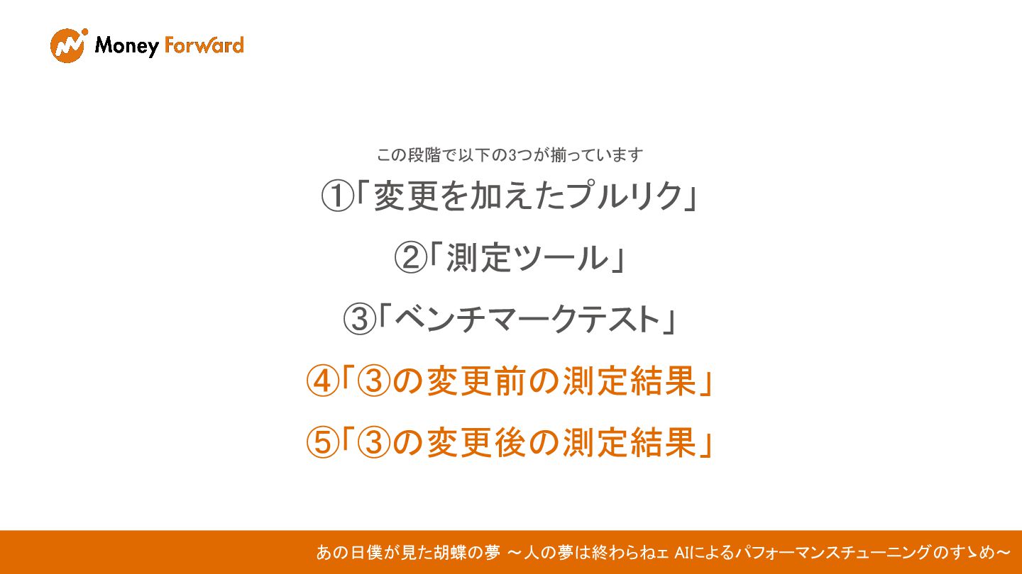 この段階で以下の3つが揃っています ①「変更を加えたプルリク」 ②「測定ツール」 ③「ベンチマークテスト」 ④「③の変更前の測定結果」 ⑤「③の変更後の測定結果」 あの日僕が見た胡蝶の夢 〜人の夢は終わらねェ AIによるパフォーマンスチューニングのすゝめ〜