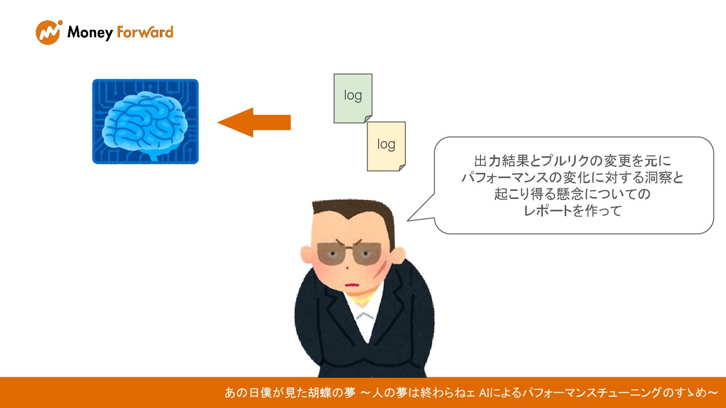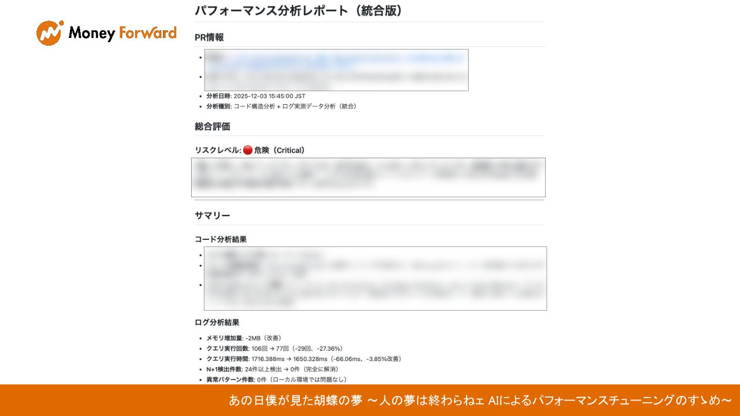 出力結果とプルリクの変更を元に パフォーマンスの変化に対する洞察と 起こり得る懸念についての レポートを作って あの日僕が見た胡蝶の夢 〜人の夢は終わらねェ AIによるパフォーマンスチューニングのすゝめ〜
