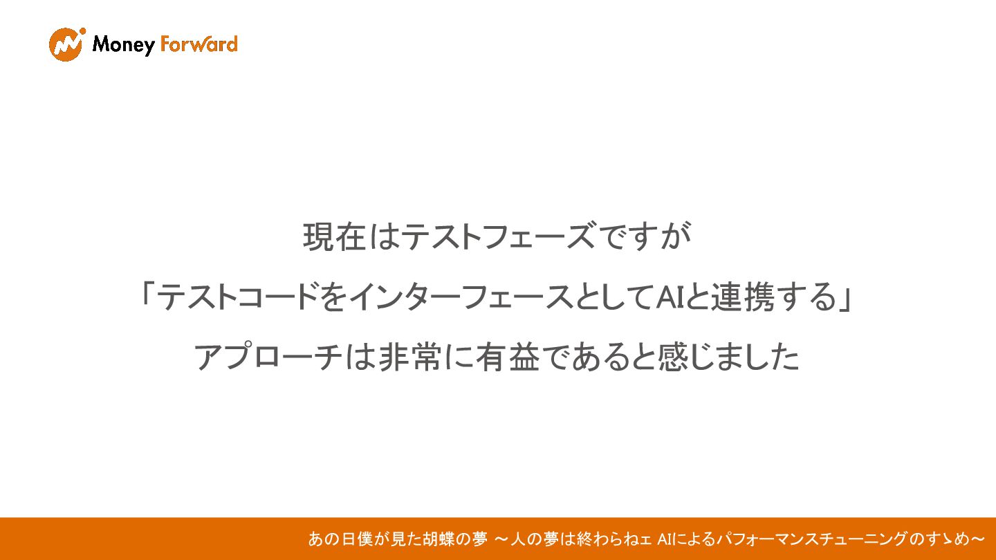 現在はテストフェーズですが 「テストコードをインターフェースとしてAIと連携する」 アプローチは非常に有益であると感じました あの日僕が見た胡蝶の夢 〜人の夢は終わらねェ AIによるパフォーマンスチューニングのすゝめ〜