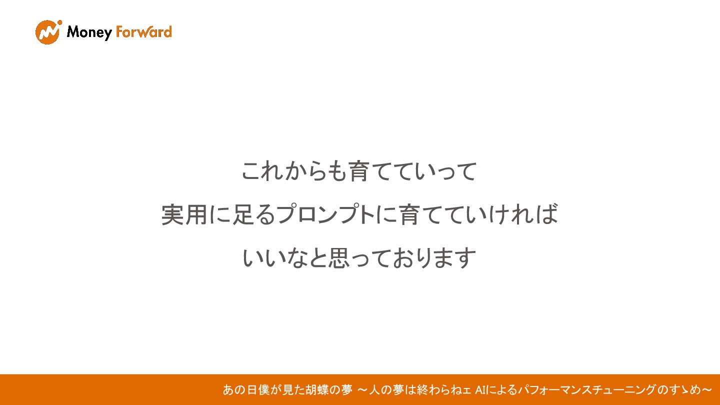 これからも育てていって 実用に足るプロンプトに育てていければ いいなと思っております あの日僕が見た胡蝶の夢 〜人の夢は終わらねェ AIによるパフォーマンスチューニングのすゝめ〜