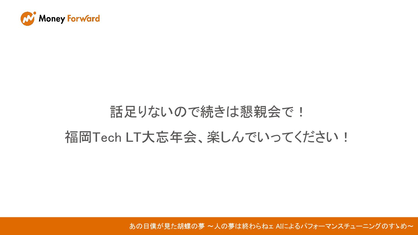 話足りないので続きは懇親会で! 福岡Tech LT大忘年会、楽しんでいってください! あの日僕が見た胡蝶の夢 〜人の夢は終わらねェ AIによるパフォーマンスチューニングのすゝめ〜