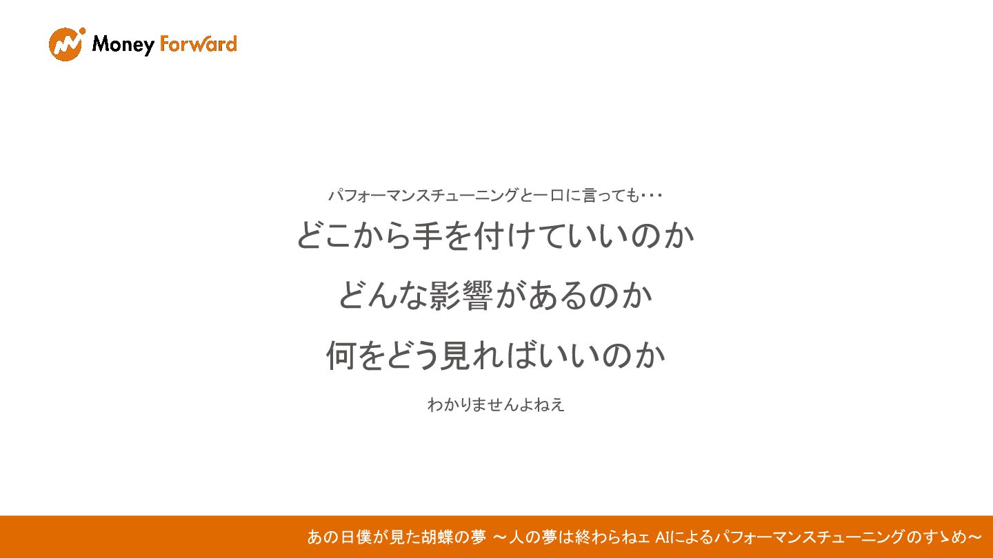 パフォーマンスチューニングと一口に言っても・・・ どこから手を付けていいのか どんな影響があるのか 何をどう見ればいいのか わかりませんよねえ あの日僕が見た胡蝶の夢 〜人の夢は終わらねェ AIによるパフォーマンスチューニングのすゝめ〜