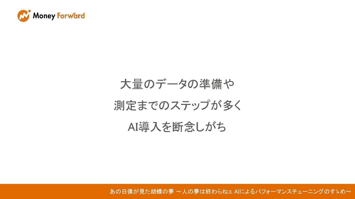 大量のデータの準備や 測定までのステップが多く AI導入を断念しがち あの日僕が見た胡蝶の夢 〜人の夢は終わらねェ AIによるパフォーマンスチューニングのすゝめ〜