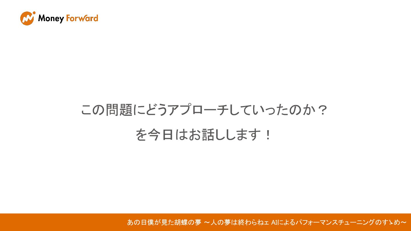 この問題にどうアプローチしていったのか? を今日はお話しします! あの日僕が見た胡蝶の夢 〜人の夢は終わらねェ AIによるパフォーマンスチューニングのすゝめ〜