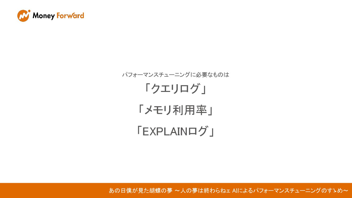 パフォーマンスチューニングに必要なものは 「クエリログ」 「メモリ利用率」 「EXPLAINログ」 あの日僕が見た胡蝶の夢 〜人の夢は終わらねェ AIによるパフォーマンスチューニングのすゝめ〜