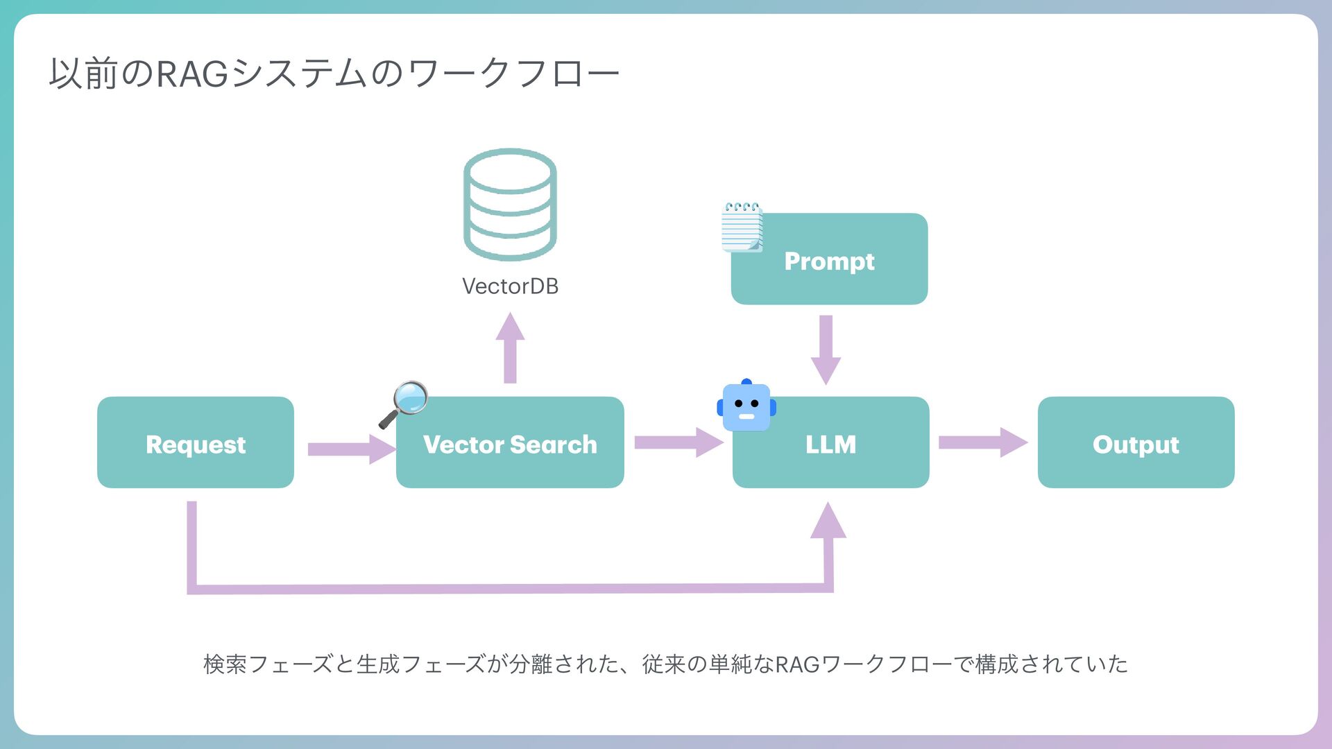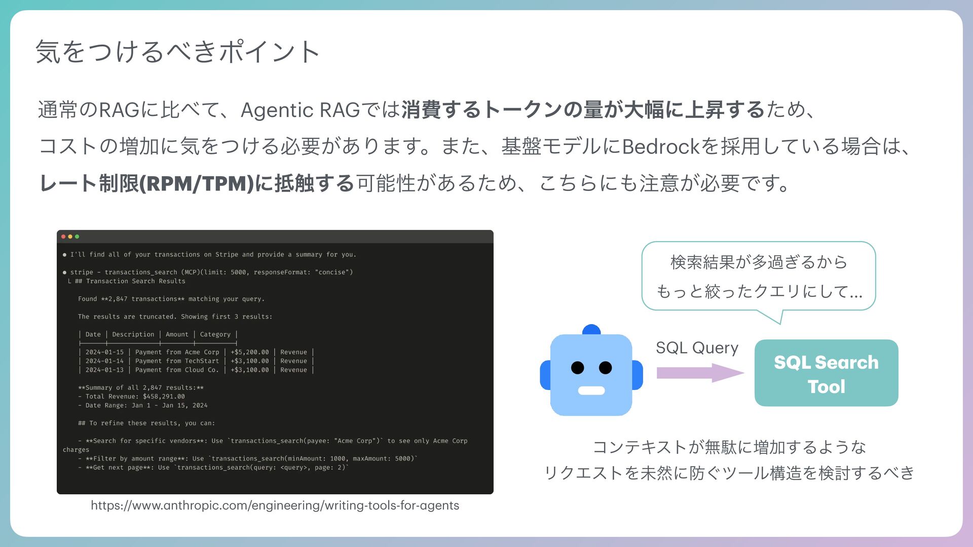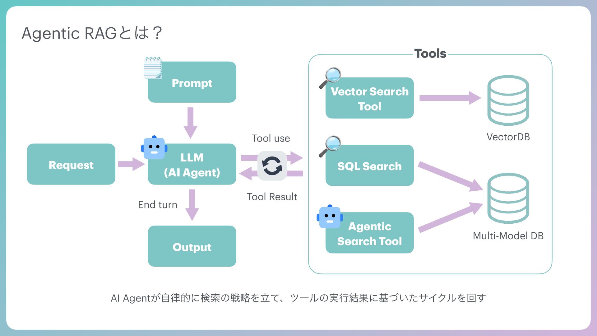 Tool Agentic Se a rch Tool SQL Se a rch Request Tool use Tool Result VectorDB Multi-Model DB Prompt Output End turn AI Agent͕ࣗతʹݕࡧͷઓུΛཱͯɺπʔϧͷ࣮ߦ݁Ռʹج͍ͮͨαΠΫϧΛճ͢
